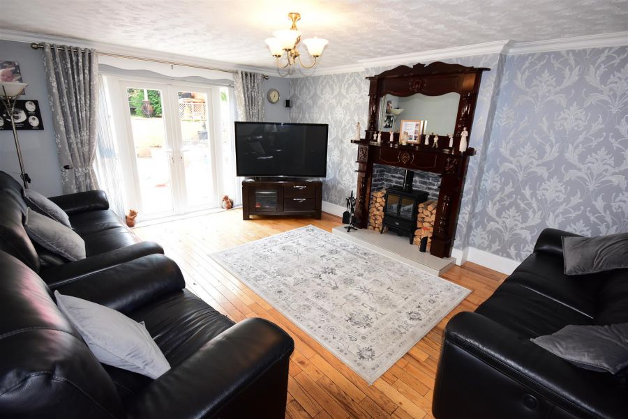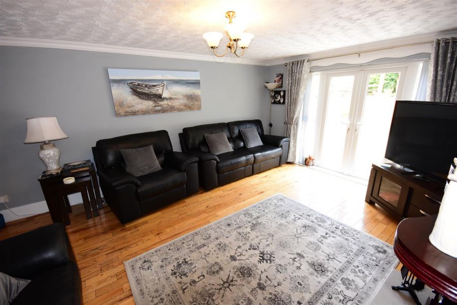 Large living room 17' x 13' with PVC double glazed French doors to rear