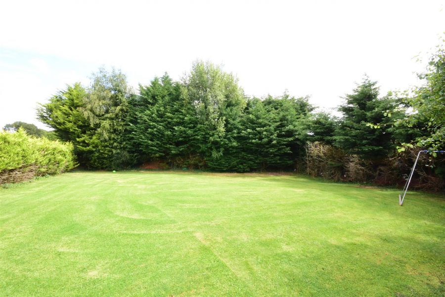 Mostly tarmaced parking to side for up to four cars / Access to detached garage 31' x 18' / Fully enclosed concrete yard area to rear with steps up to large, raised garden in neat lawn and mature coni