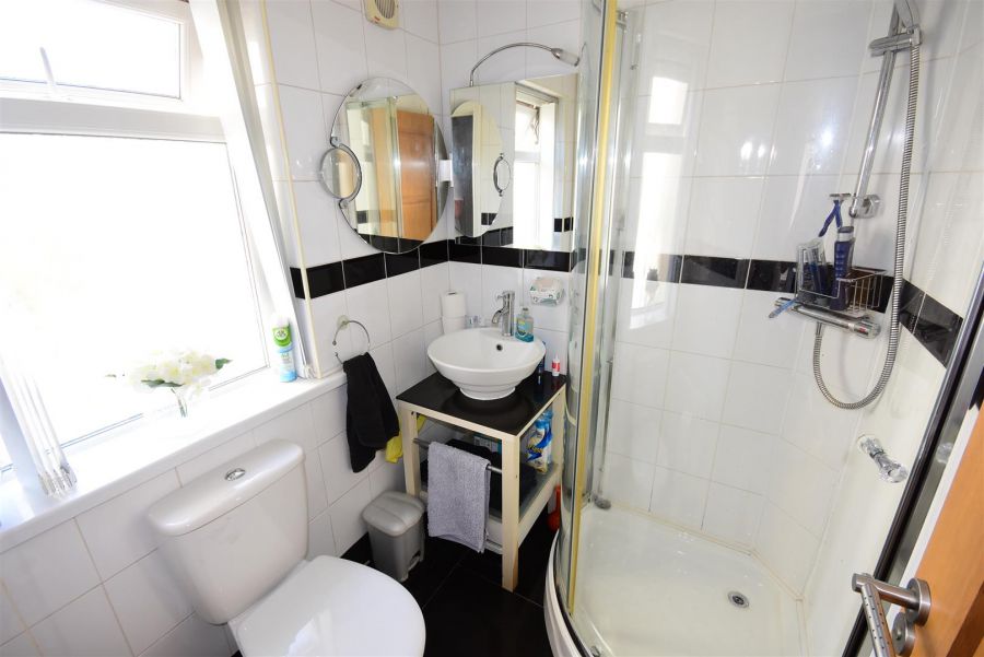 Modern white suite comprising push button low flush W/C and fully tiled corner quadrant shower cubicle with thermostatic shower unit and sliding cubicle doors. Open vanity unit with "sit on top" circular wash hand basin with "monobloc" mixer taps. Fully tiled walls and floor. Extractor fan. Single radiator.