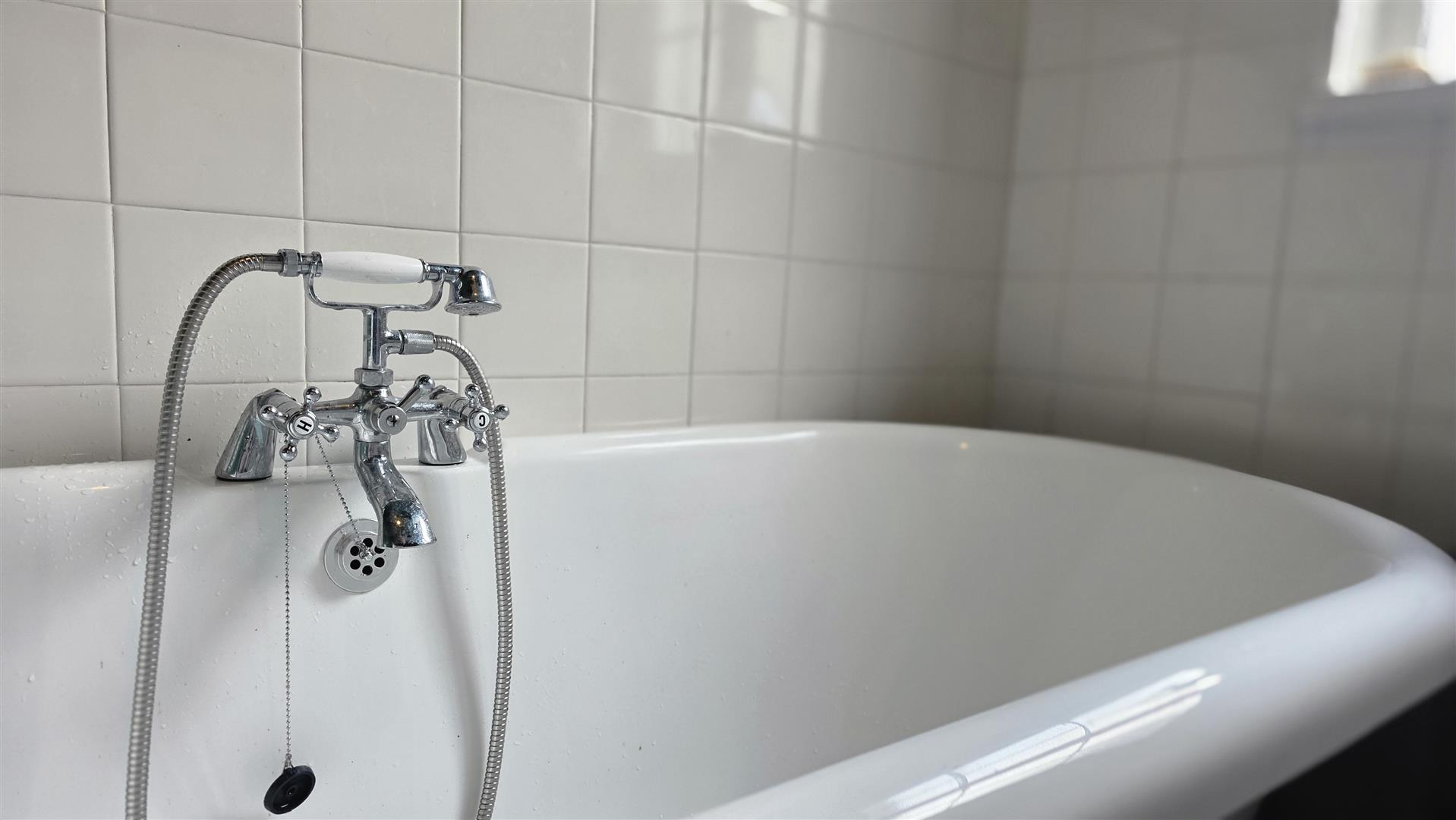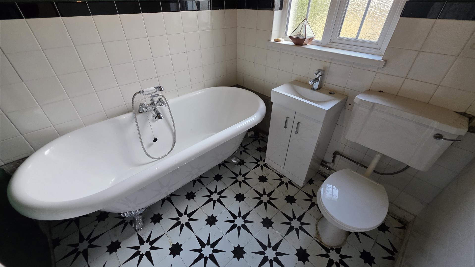 White suite comprising free-standing roll top bath with polished chrome ball and claw feet. Off set antique style mixer tap and shower attachment. Low flush W/C. Moulded wash hand basin in vanity with mixer tap and storage below. Part tiled walls. Single radiator.