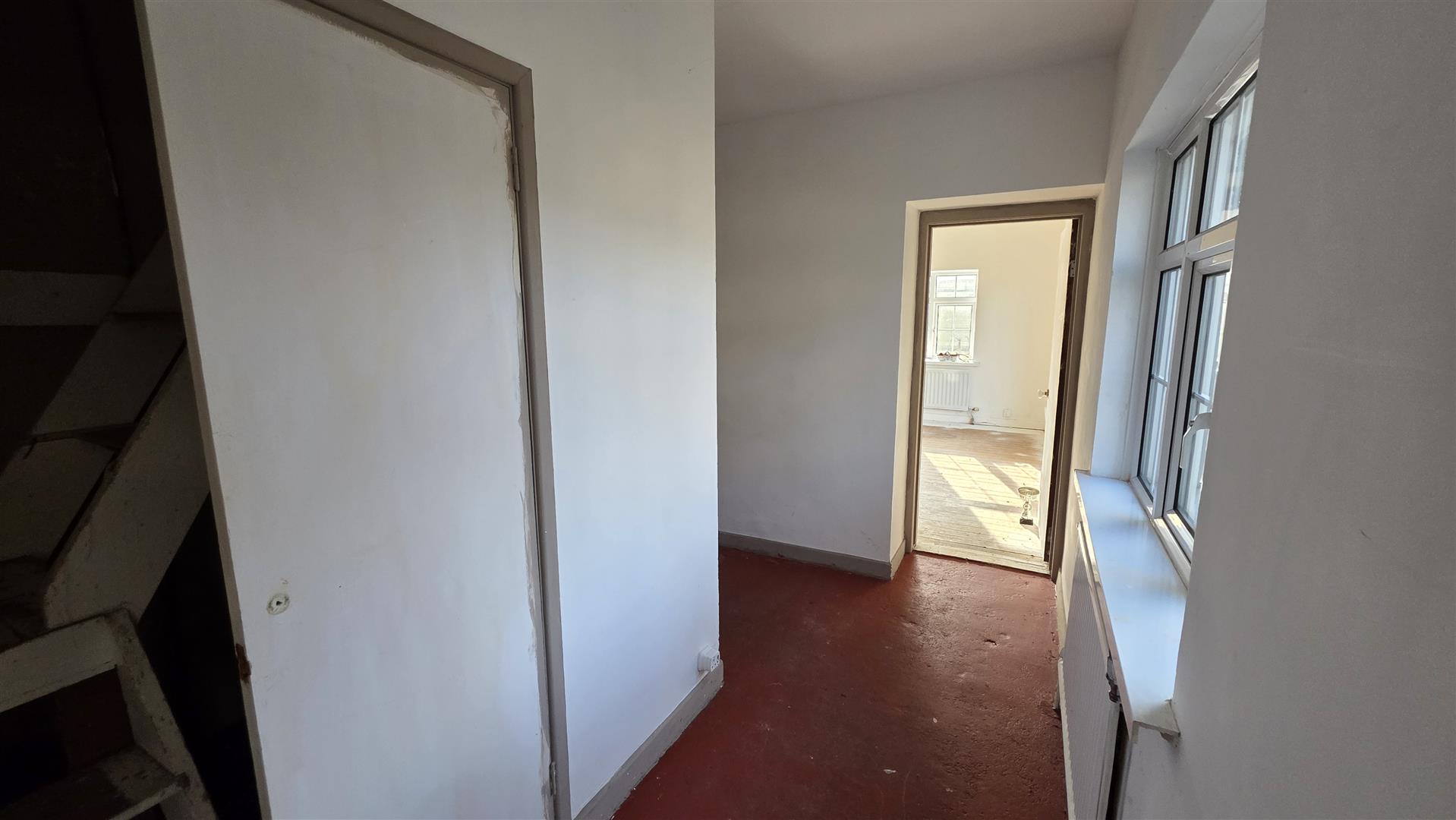 Single radiator. Double door to storage cupboard with fixed stair access to attic with three rooflights. Hot press with copper cylinder and immersion heater. Shelving above. High level meter cupboard.