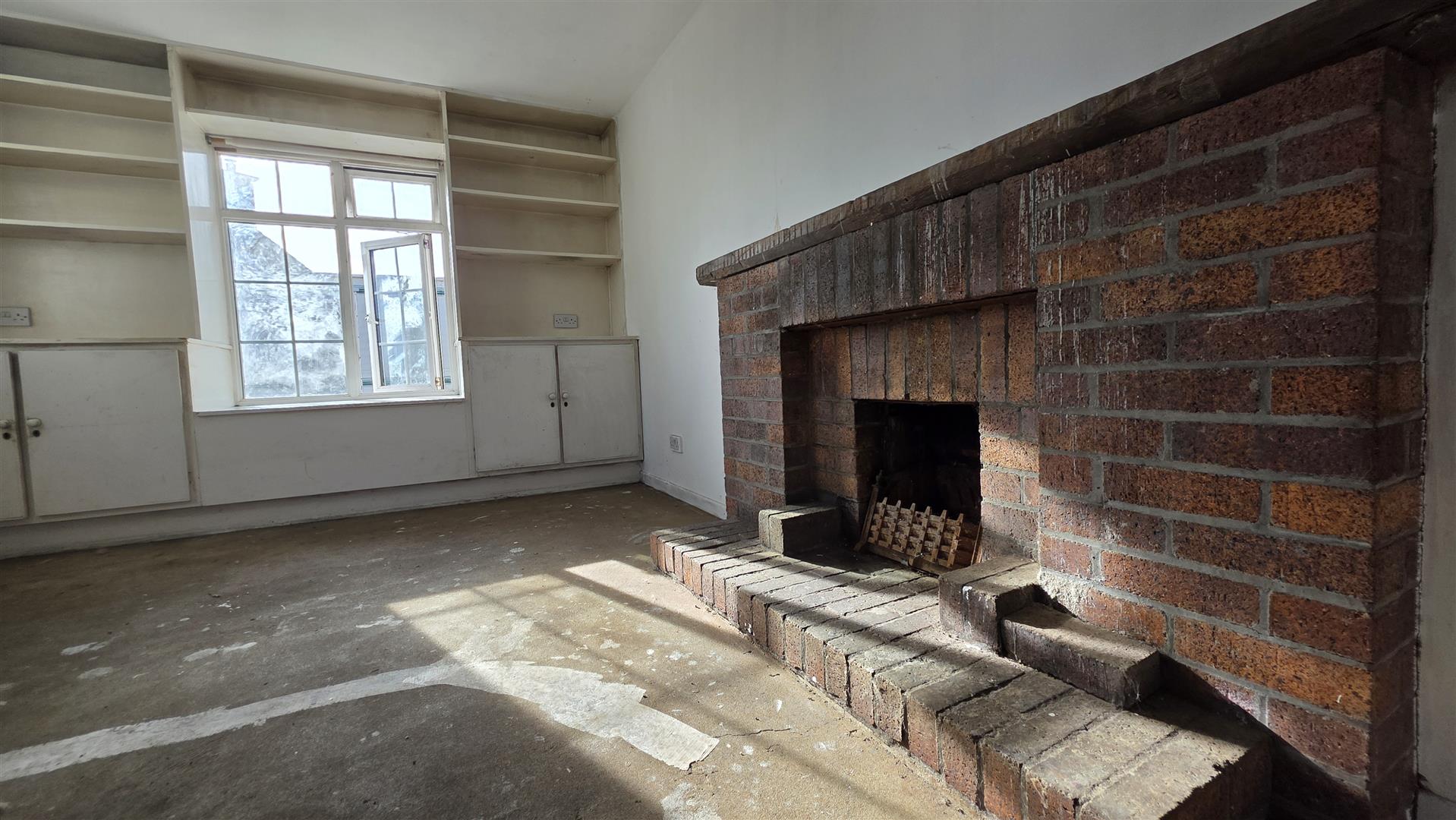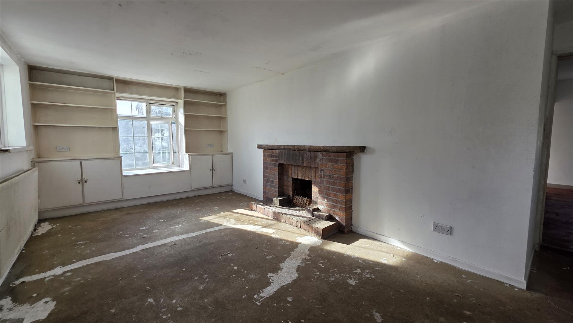 Living room 21'4 x 10'5 with open fire and brick surround / Built-in storage cupboards, shelving and window seat