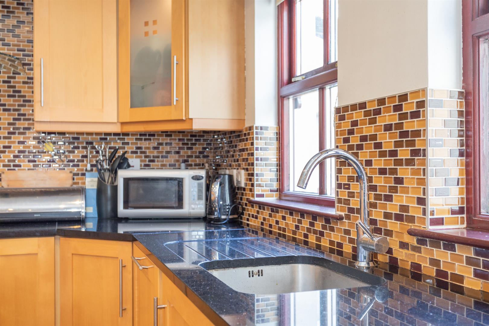Full range of part coloured high and low level units with contrasting work surfaces. Single drainer stainless steel sink unit and mixer taps. Plumbed for washing machine and space for dryer. Corniced ceiling. Chinese slate floor. Double radiator. Hard wood double glazed door to covered rear porch.
