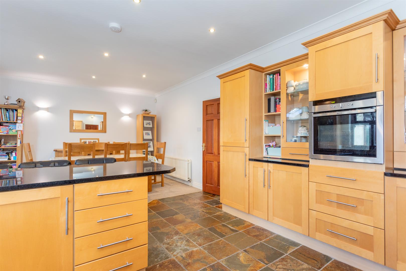 Kitchen with informal dining area 24'4 x 13'2 / Full range of beech effect "Shaker" style high and low level units / Polished granite work tops / Integrated oven, hob, fridge freezer and dishwasher /