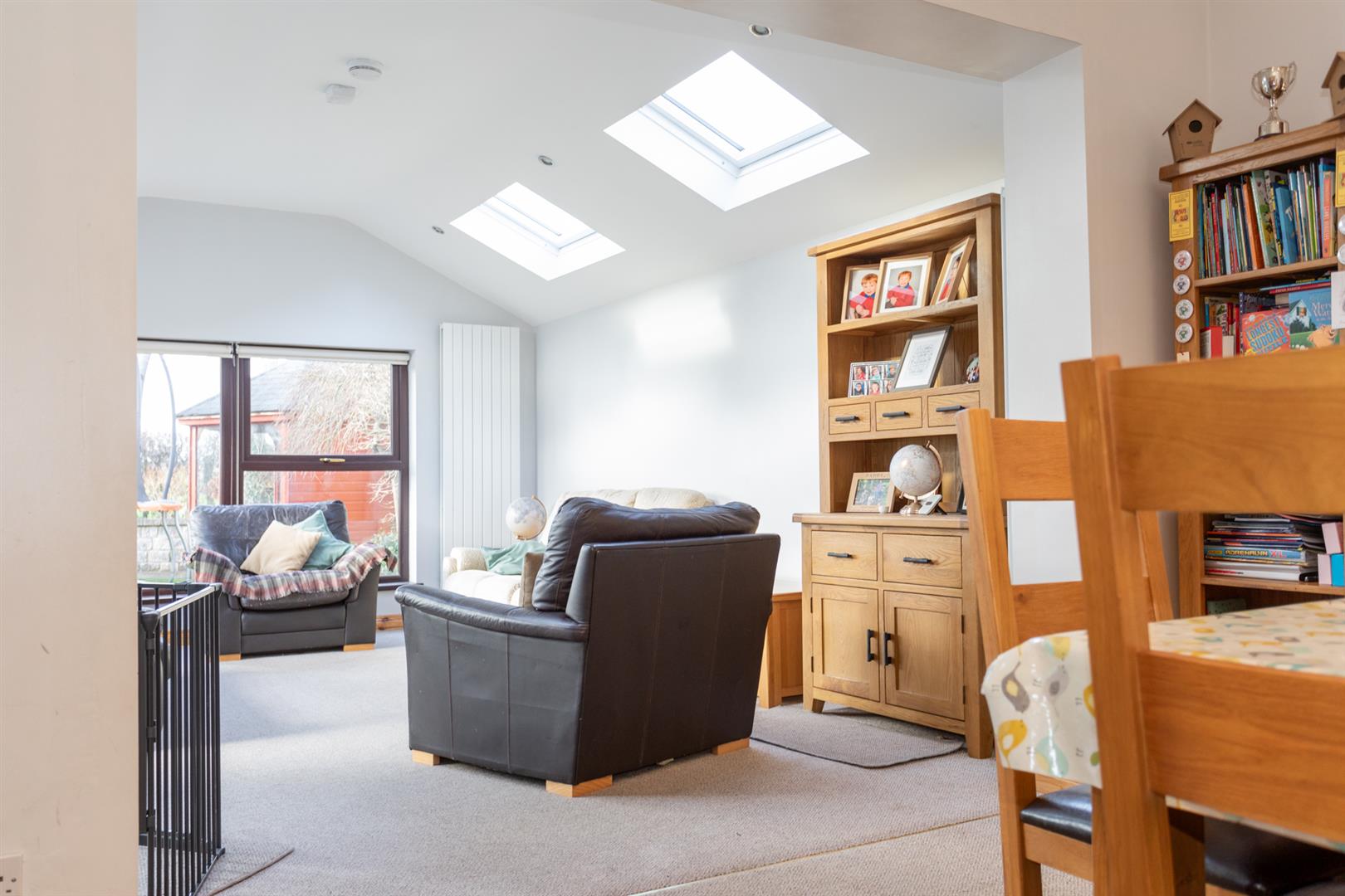 Semi-vaulted ceiling with four "Keylite" double glazed roof lights. Mahogany effect PVC double glazed windows and French doors. Free standing glass fronted cast iron stove. Low level radiator. Two upright designer radiators.