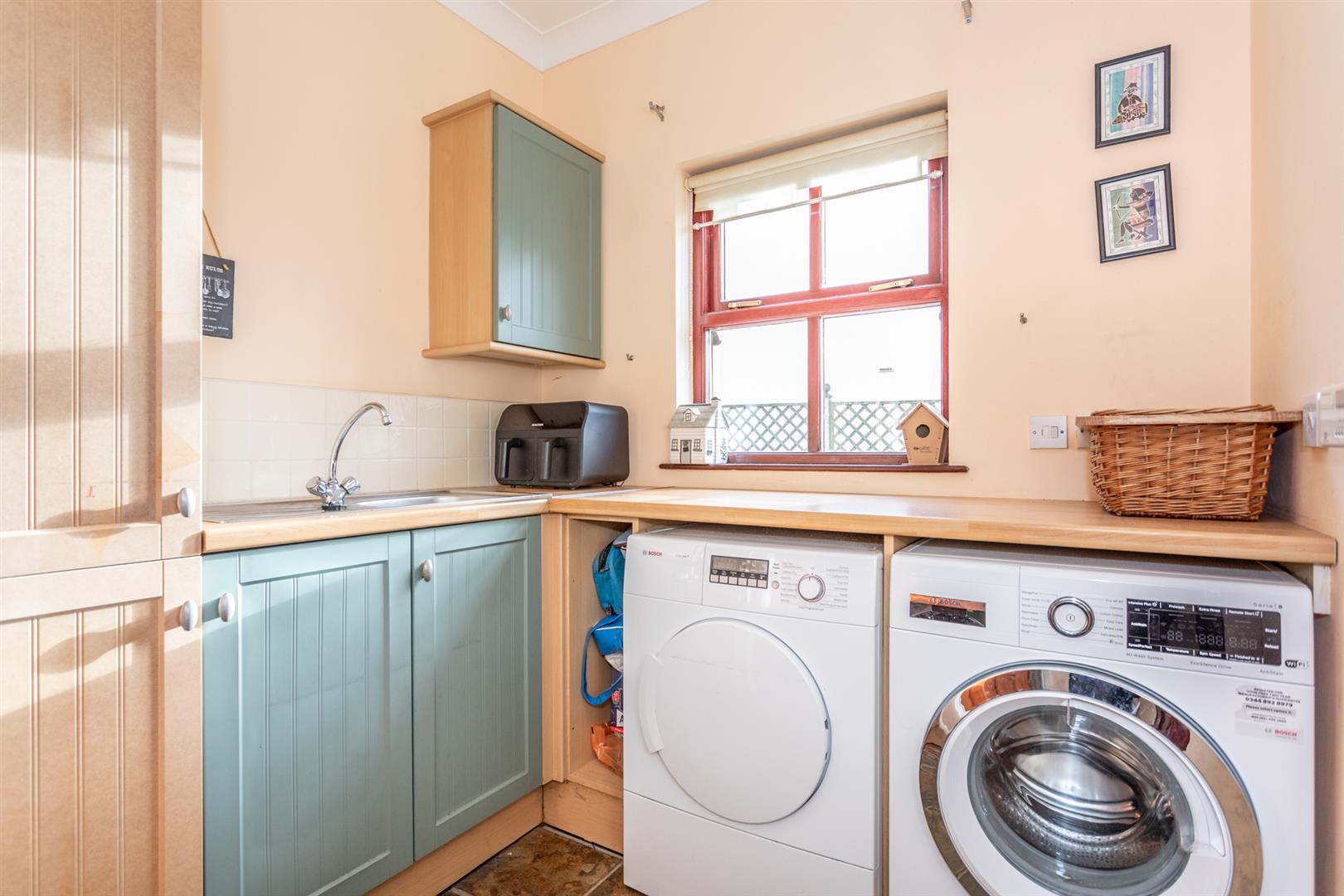 Utility room with full range of coloured high and low level units / Hardwood double glazed doors to covered rear porch