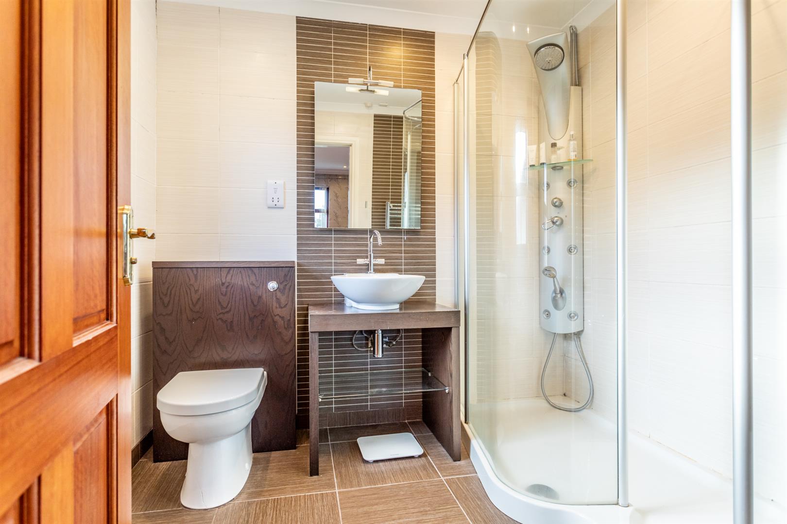 Modern white suite comprising concealed flush push button low flush W/C and feature wash hand basin on "Wenga" wood stand with mixer taps, glazed open shelf and feature floor to ceiling splash back. Walk-in feature shower area with corner "shower station" comprising drench head, 6 body jets and retractable hand held shower. Curved glass screen. Fully tiled walls and floor. Low voltage down lights. Extractor fan. Polished chrome heated towel rail.