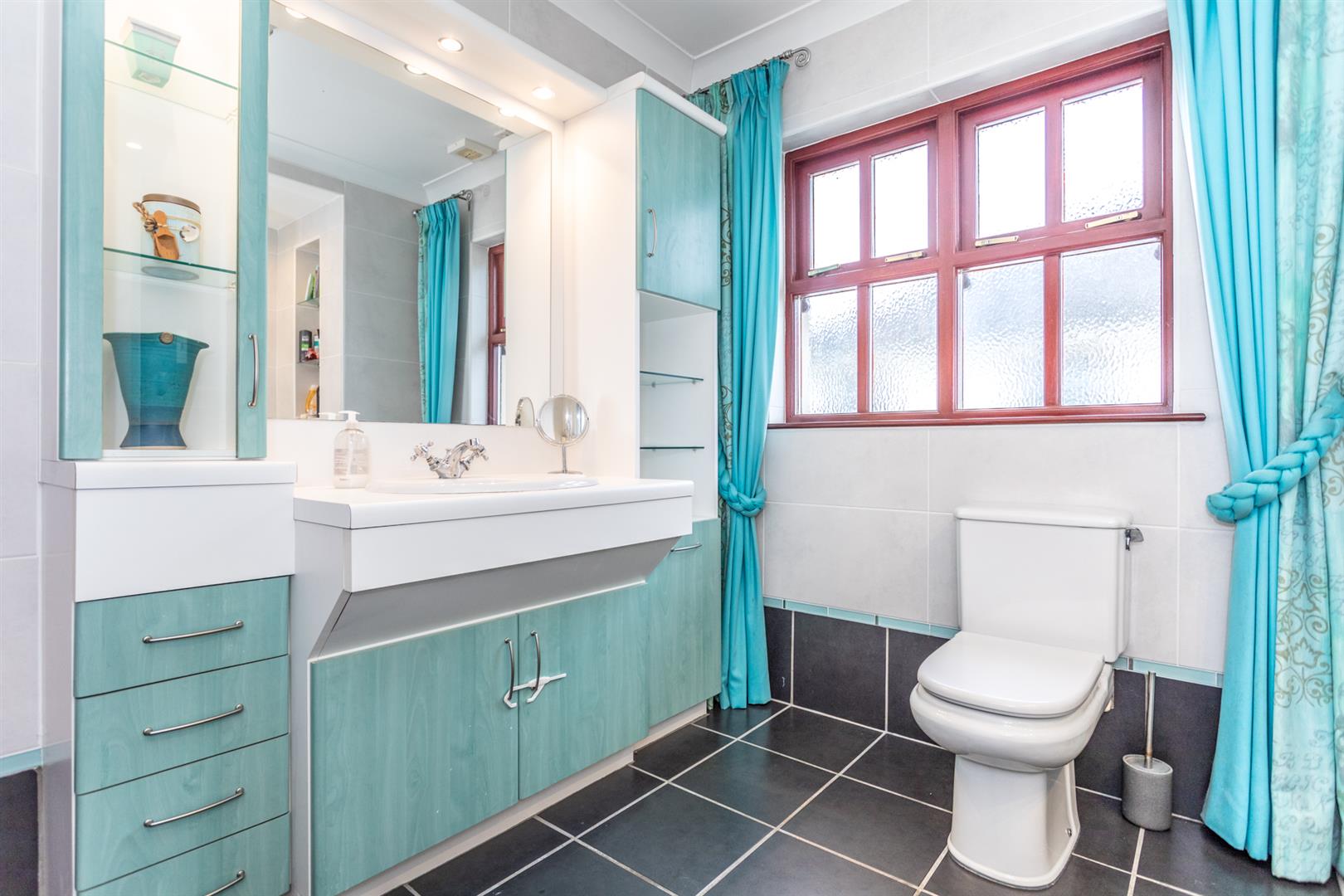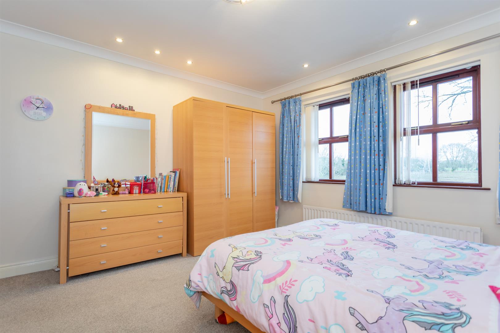 Full wall of built-in wardrobes with glazed doors and matching drawer sets and vanity unit. Low voltage down lights. Dual aspect windows. Double radiator.