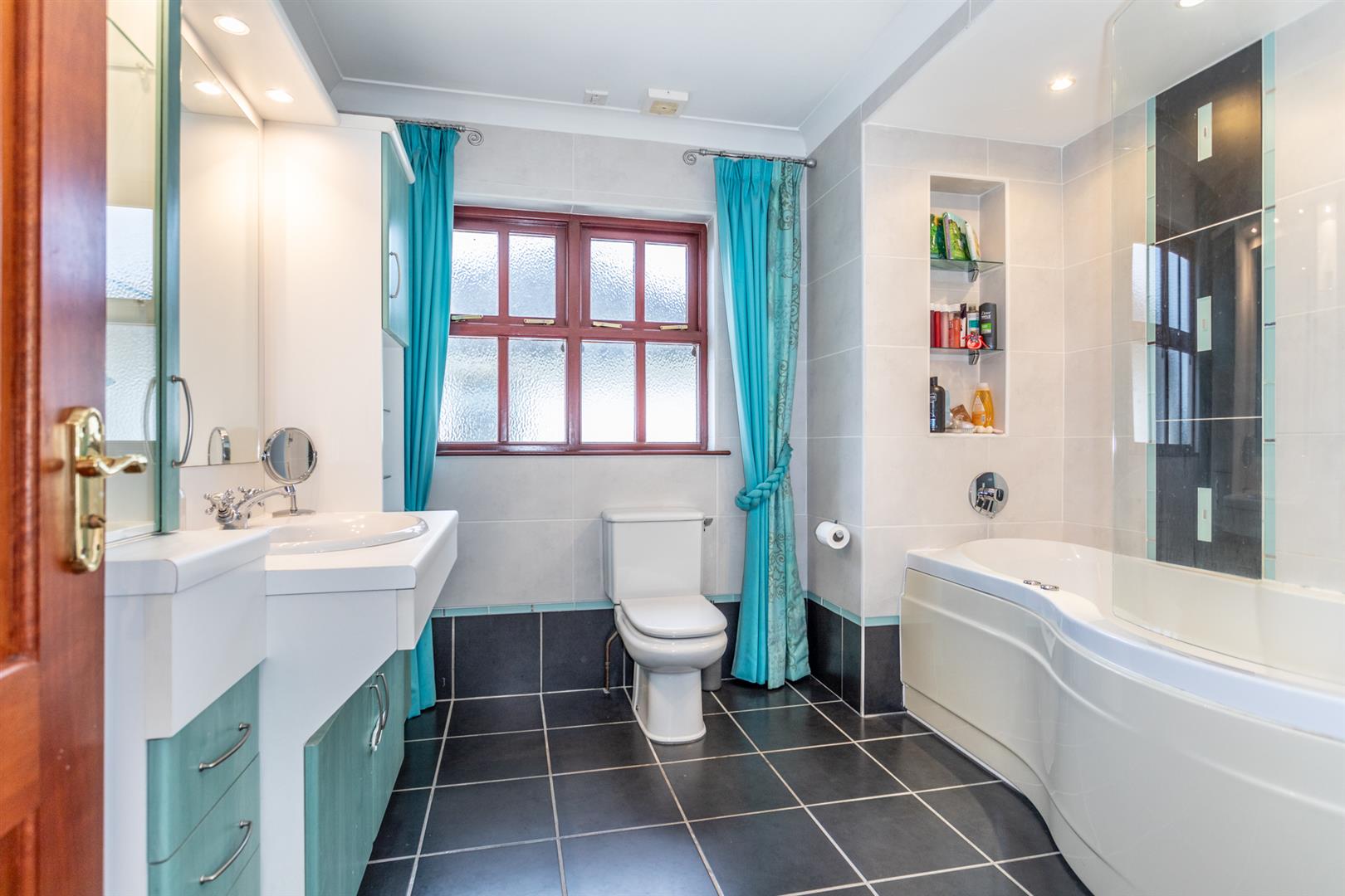 First floor landing with access to hotpress / Corniced ceiling / Family bathroom with modern white suite to include curved shower bath