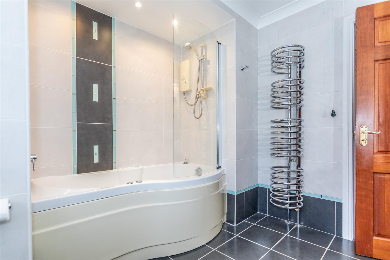 (into bath recess) Modern white suite comprising push button low flush W/C, curved shower bath with directional jets, wall mounted tap and "Mira" Advance shower over. Curved glass screen. Moulded wash hand basin in vanity unit with mixer taps, glazed display shelves, low level storage drawer and open shelving. Low voltage down lights. Corniced ceiling. Fully tiled floor and walls with decorative insets. Extractor fan. Feature circular polished chrome heated towel rail.