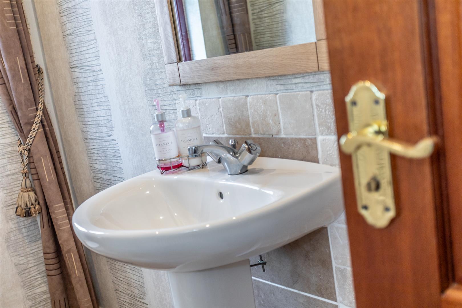 White suite comprising low flush W/C and pedestal wash hand basin with mixer taps and tiled splash back. Fully tiled floor. Low voltage down lights. High level meter cupboard. Single radiator.