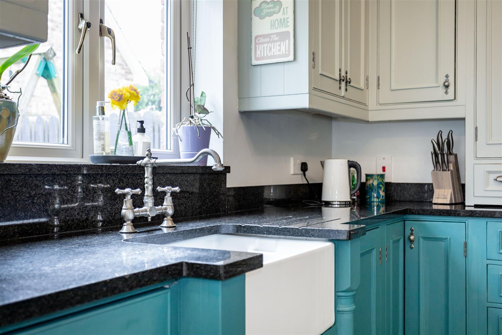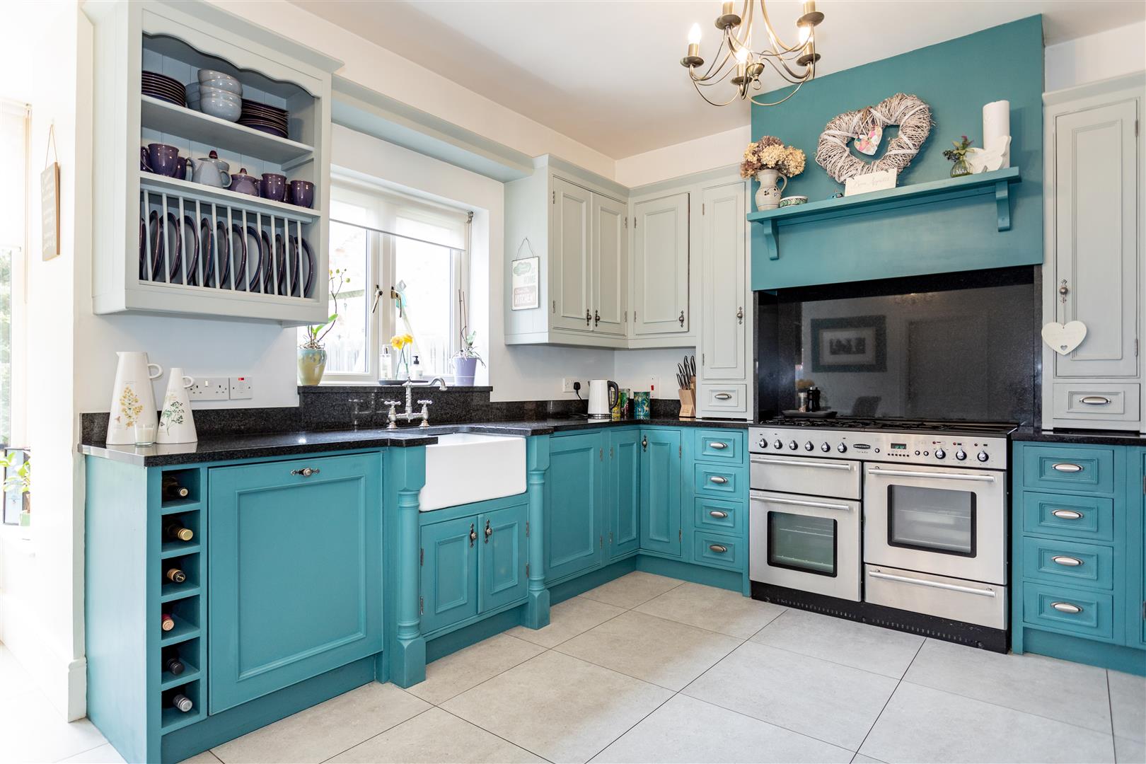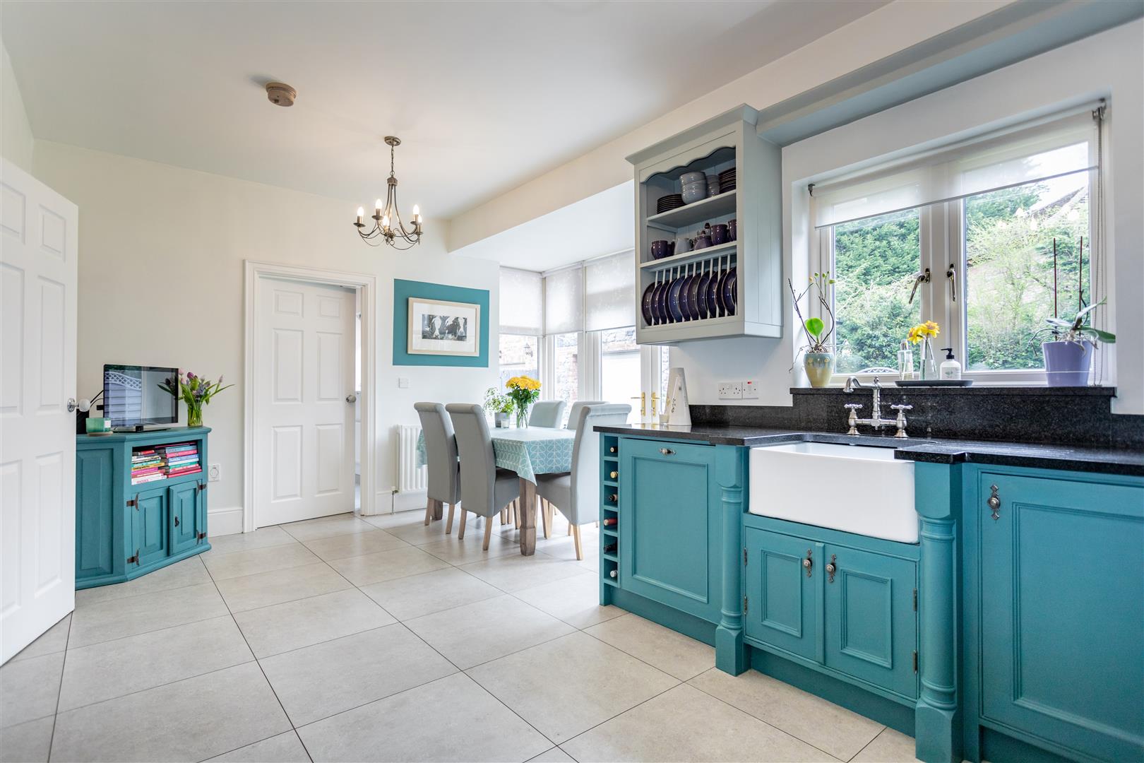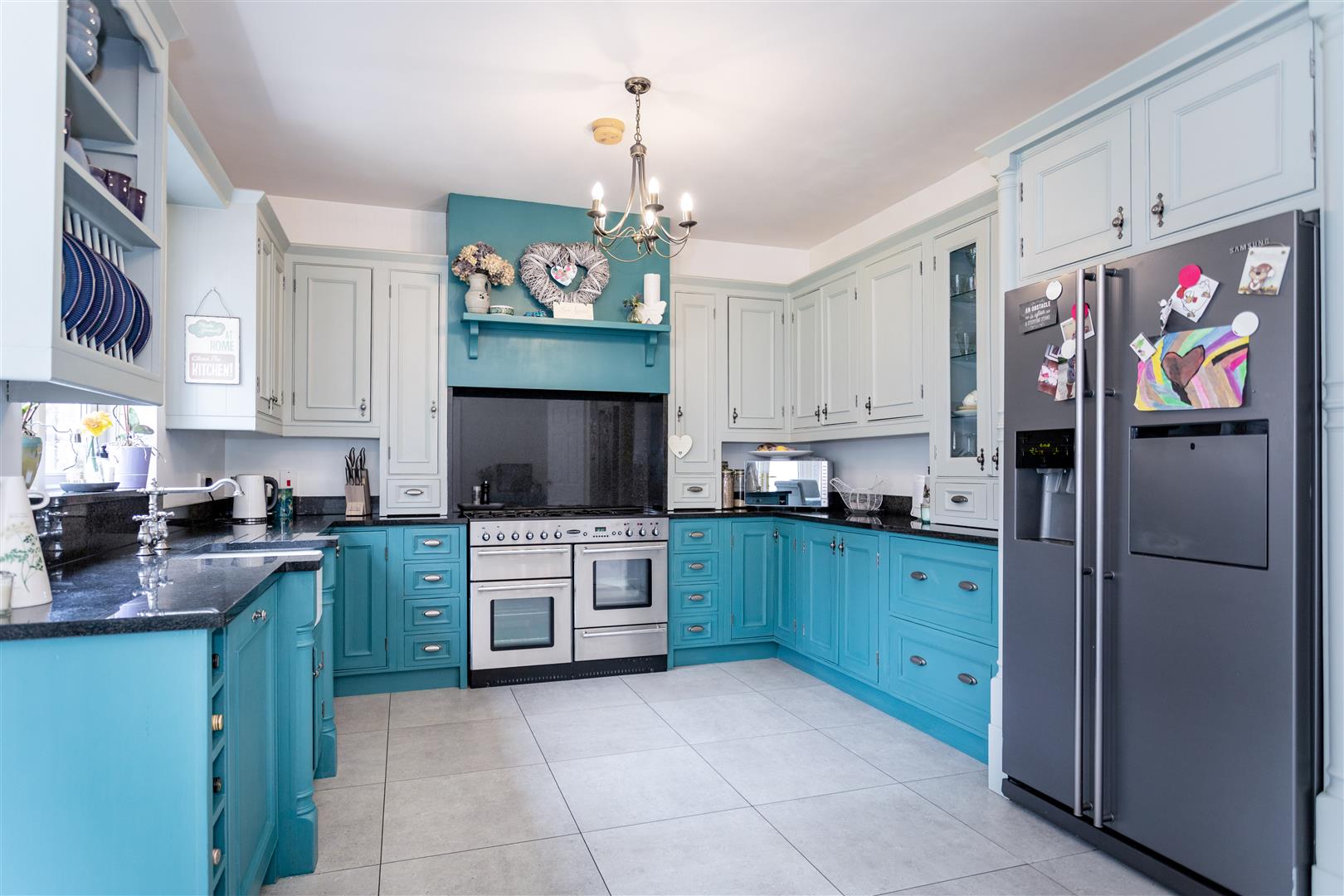 Fully fitted range of two tone Country style kitchen units with contrasting granite work tops and splash back stand. Single drainer "Belfast" style sink unit with "Victorian" style stainless steel mixer tap. Brushed stainless steel handles. Integrated dish washer. Range cooker with five ring gas hob, side hot plate, oven and grill and granite splash back (To be included). "American" style fridge freezer (To be included). Double display cabinet. Over counter lighting. Fully tiled floors. Double glazed French doors with side light to rear. Two double radiators.