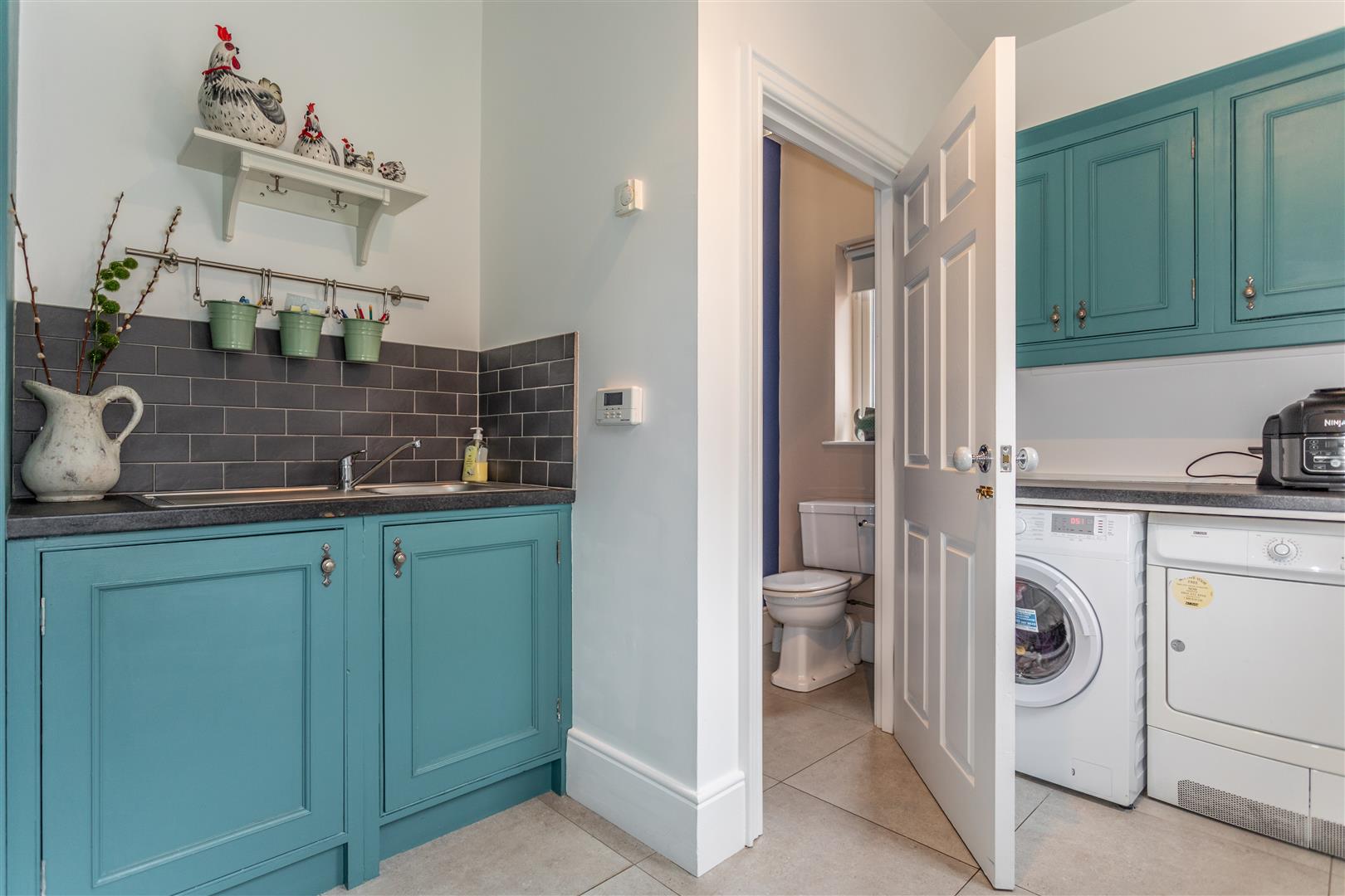 Matching range of high and level kitchen units with contrasting work tops and tiled splash back to single drainer stainless steel sink unit with chrome mixer tap. Space for washing machine and tumble dryer. Fully tiled floor. Singe radiator. Two panel double glazed door to rear.