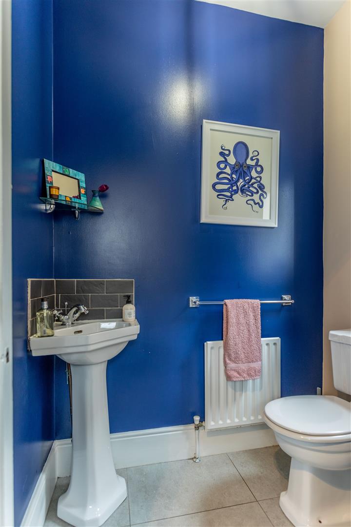 Modern white suite comprising "Victorian" style. Pedestal wash hand basin with "Victorian" style chrome mixer tap and tiled splash back. Low flush WC. Fully tiled floor. Single radiator.