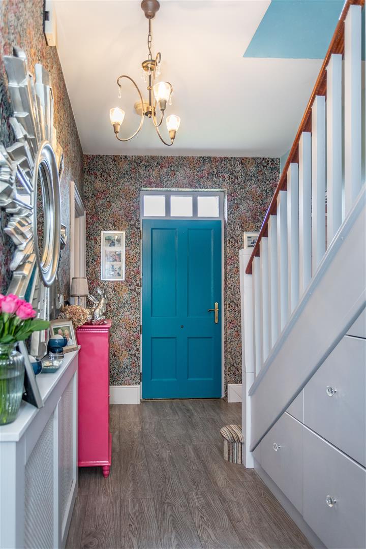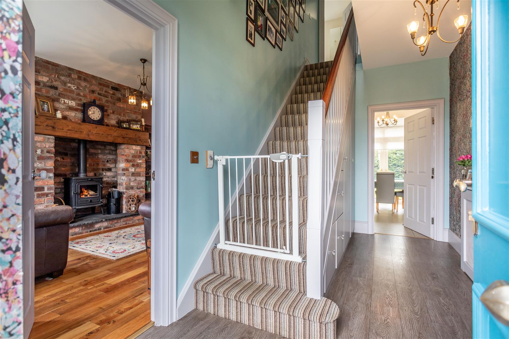 Stair case to first floor with turned balustrading and moulded hand rail. Custom understairs storage. Single radiator.