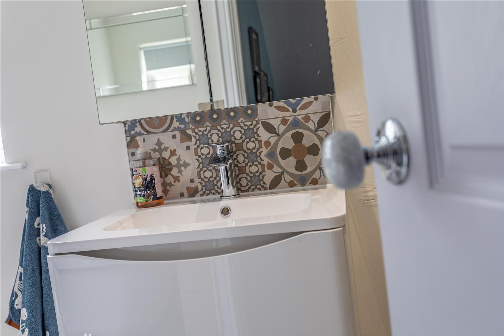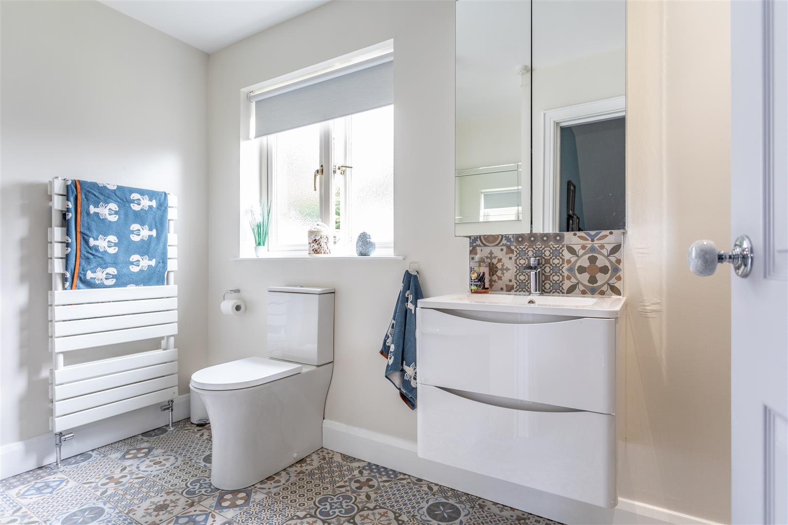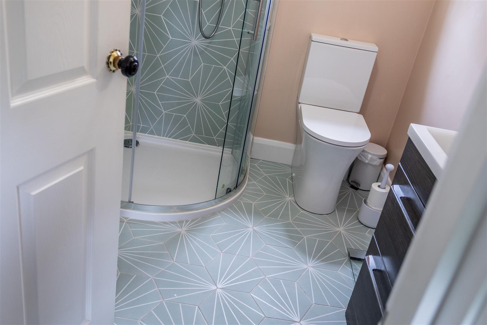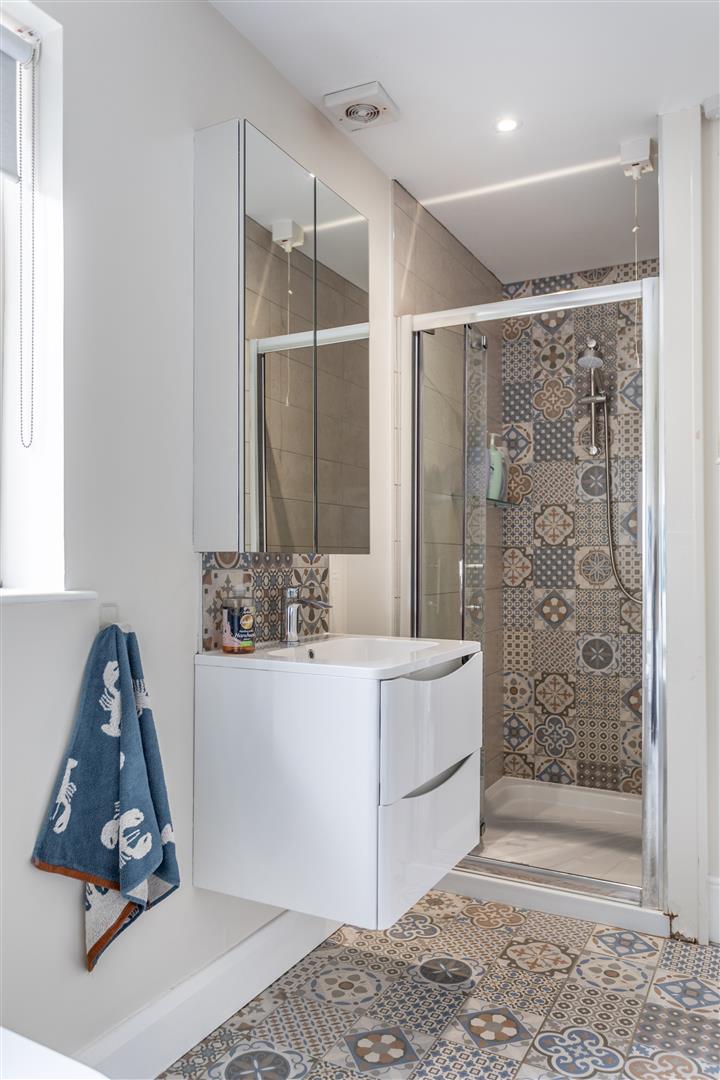 Modern three piece suite comprising enclosed corner shower unit with hexagonal tiled walls and glazed sliding door. Wall mounted wash hand basin with chrome mixer tap and tiled splash back. Low flush push button WC. Fully tiled floor. Extractor fan. Chrome towel radiator.