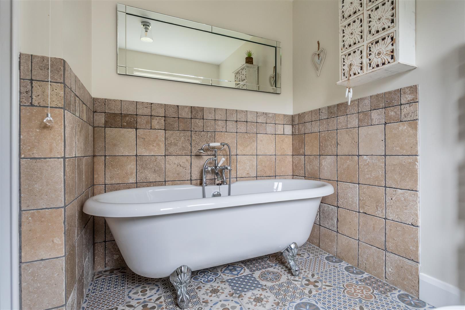 (at max) Luxury four piece bathroom suite comprising a free standing roll top ball and crawl bath with "Victorian style" chrome mixer tap, shower attachment and tiled surround. Wall mounted wash hand basin with chrome mixer tap, tiled splash back and storage below. Wall to wall shower unit with "Mira Sport" shower, fully tiled walls and glazed sliding door. Low flush push button WC. Fully tiled floor. Extractor fan. Double towel radiator.