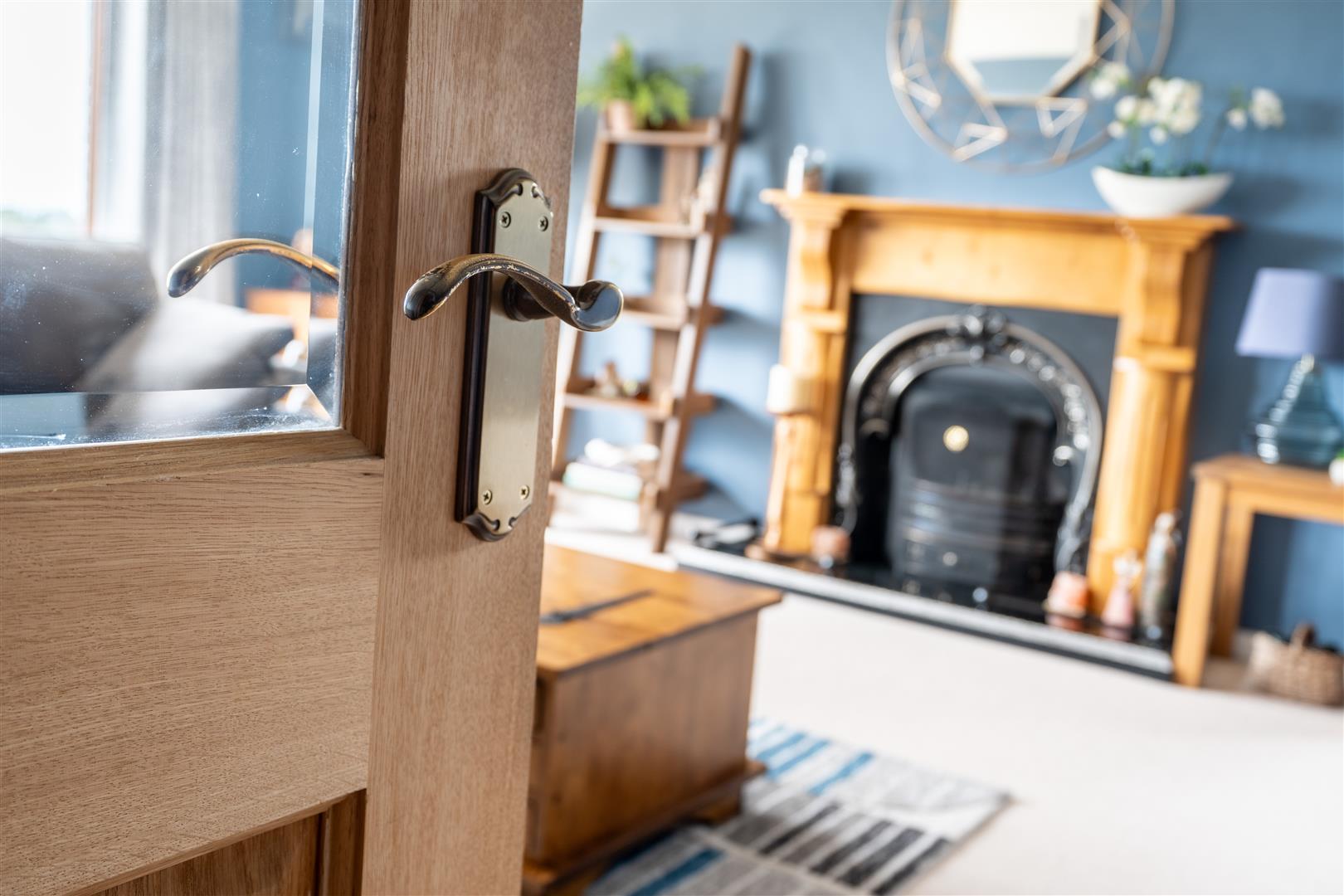 Open fire with ornate wooden surround, part polished cast iron inset and polished granite hearth. Dual aspect windows to include oak effect PVC double glazed French doors to patio area. Two double radiators. Part bevelled glass door to entrance hall.