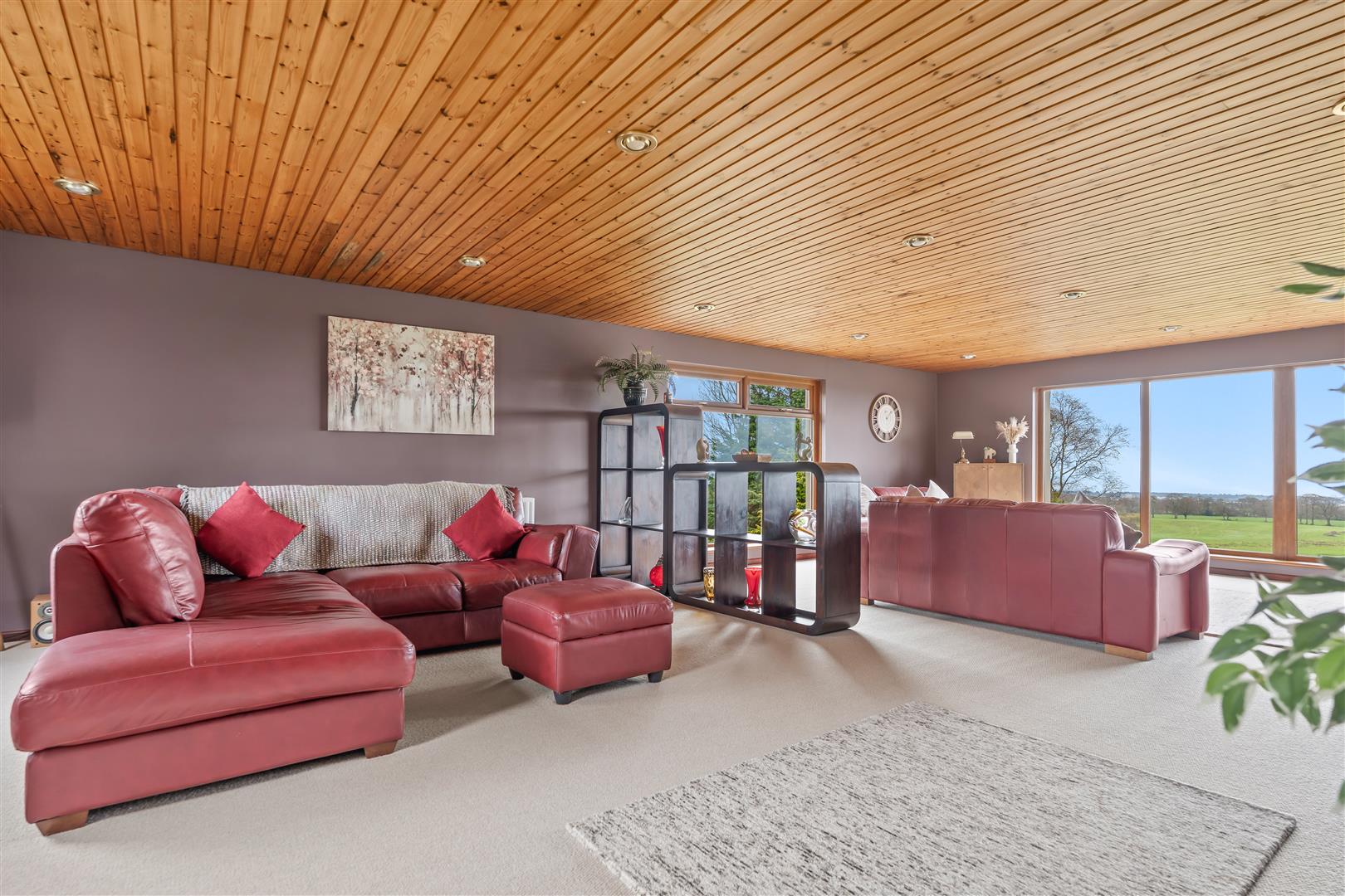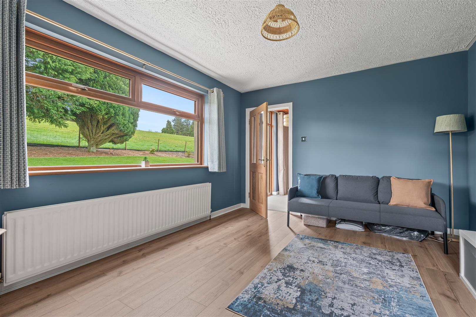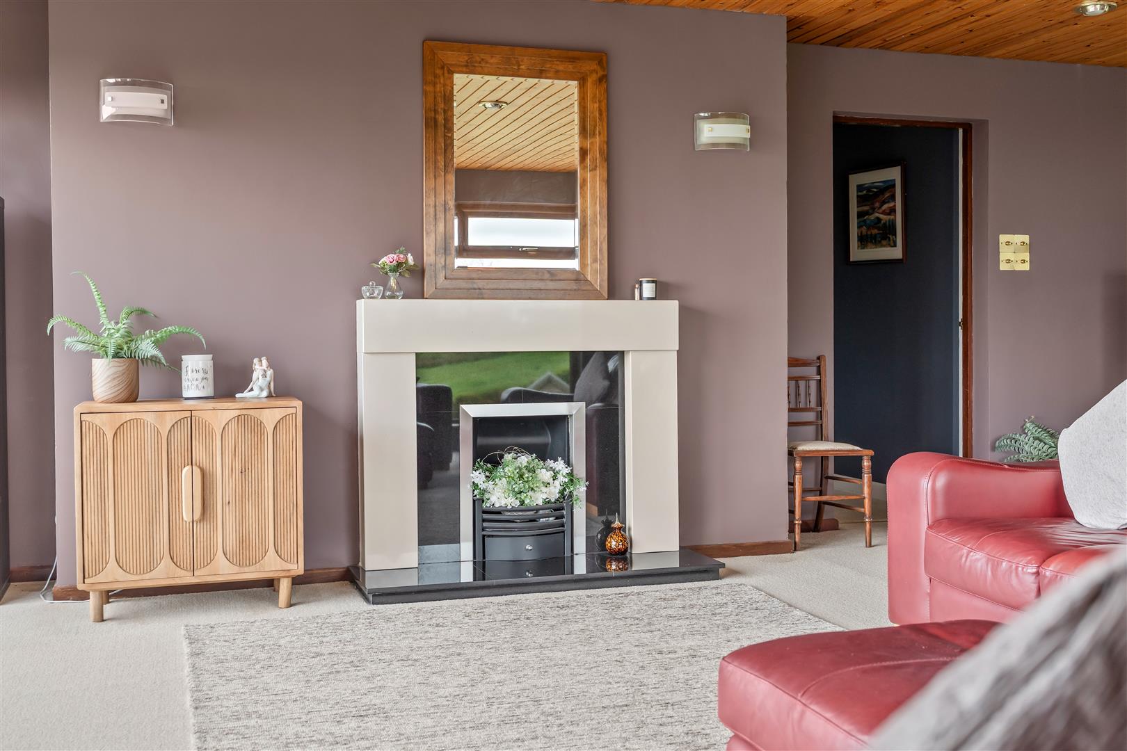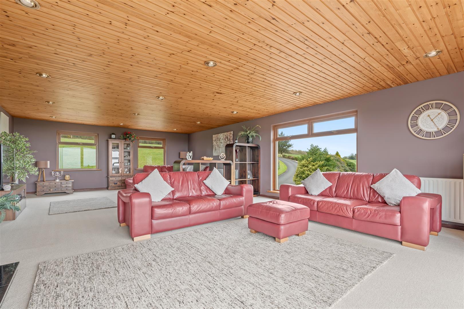 Wood strip ceiling. Large formal picture window with views over open countryside to the Sperrin Mountains and Lough Neagh. Triple aspect windows. Open fire with polished marble surround, polished granite inset and hearth. Twin wall light points. Eyeball spotlights. Three double radiators.