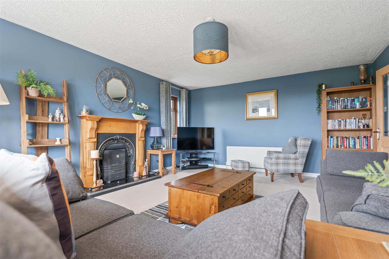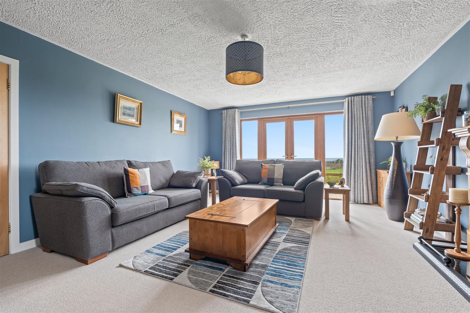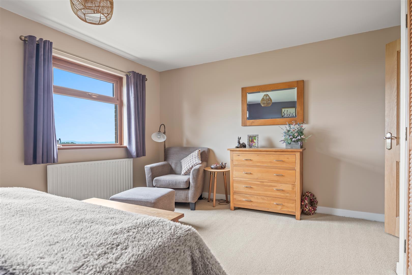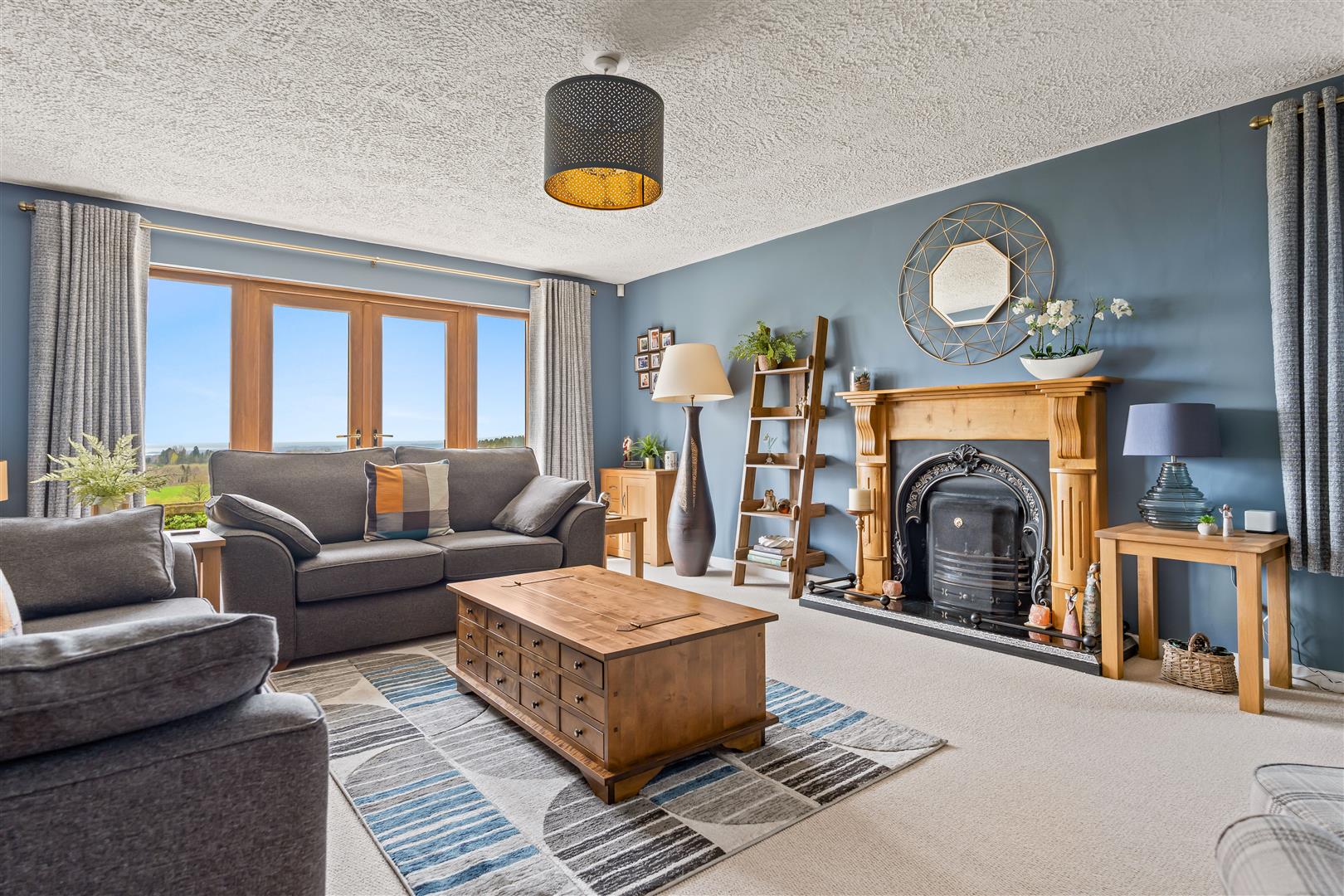 Wood strip ceiling. Large formal picture window with views over open countryside to the Sperrin Mountains and Lough Neagh. Triple aspect windows. Open fire with polished marble surround, polished granite inset and hearth. Twin wall light points. Eyeball spotlights. Three double radiators.