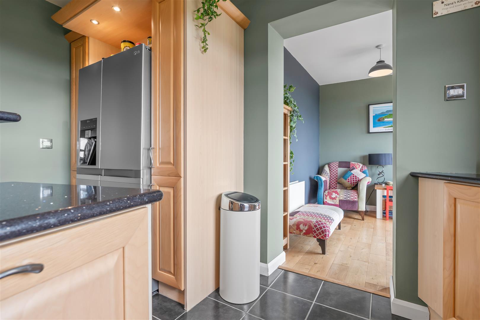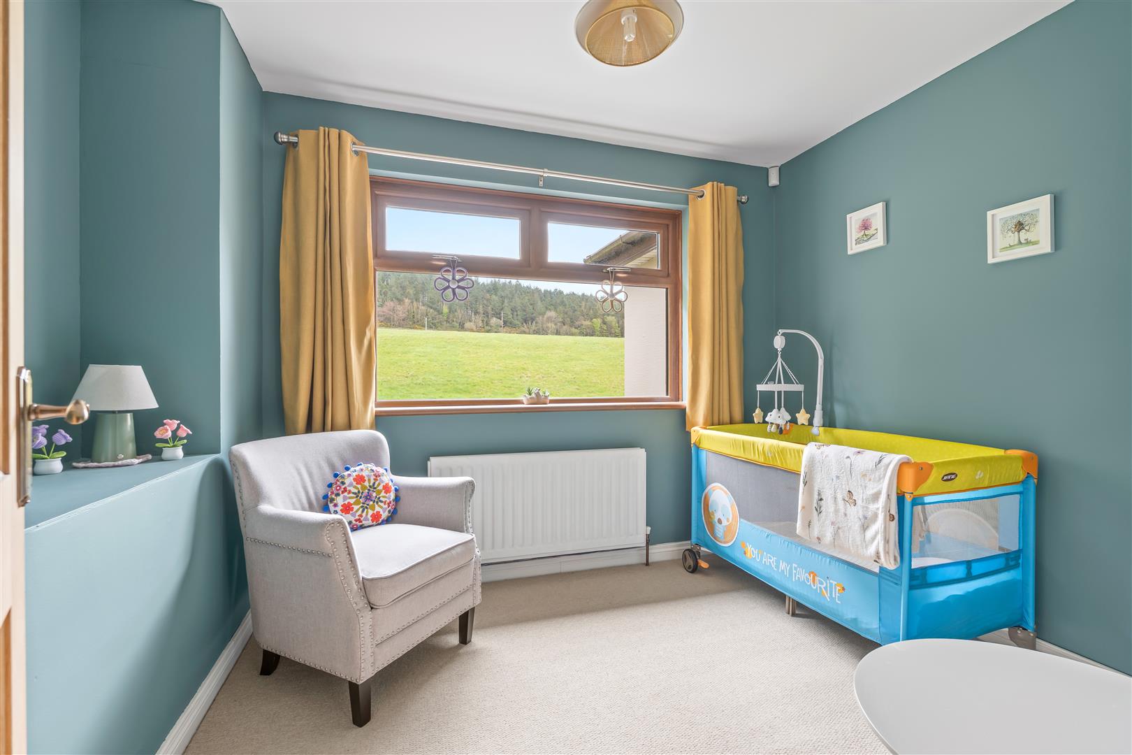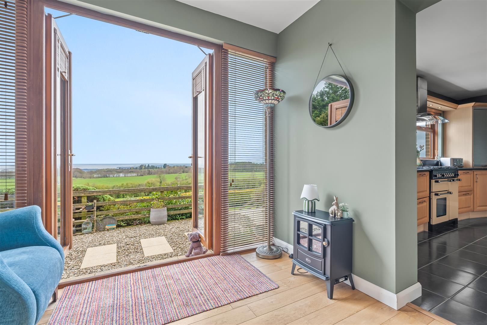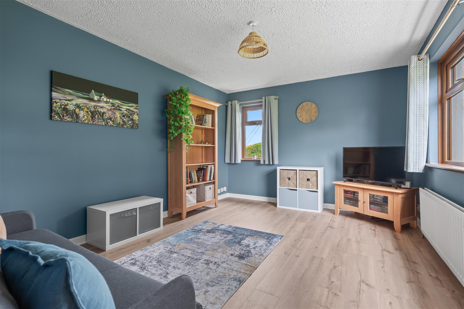 Wood strip ceiling. Large formal picture window with views over open countryside to the Sperrin Mountains and Lough Neagh. Triple aspect windows. Open fire with polished marble surround, polished granite inset and hearth. Twin wall light points. Eyeball spotlights. Three double radiators.