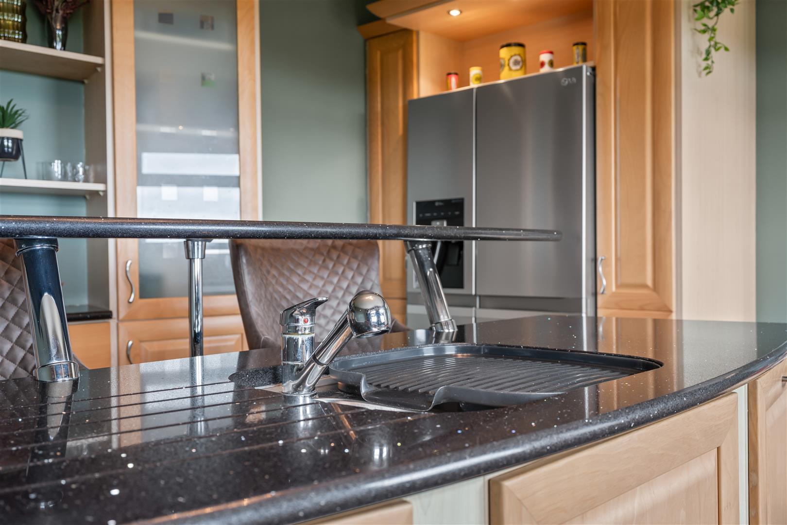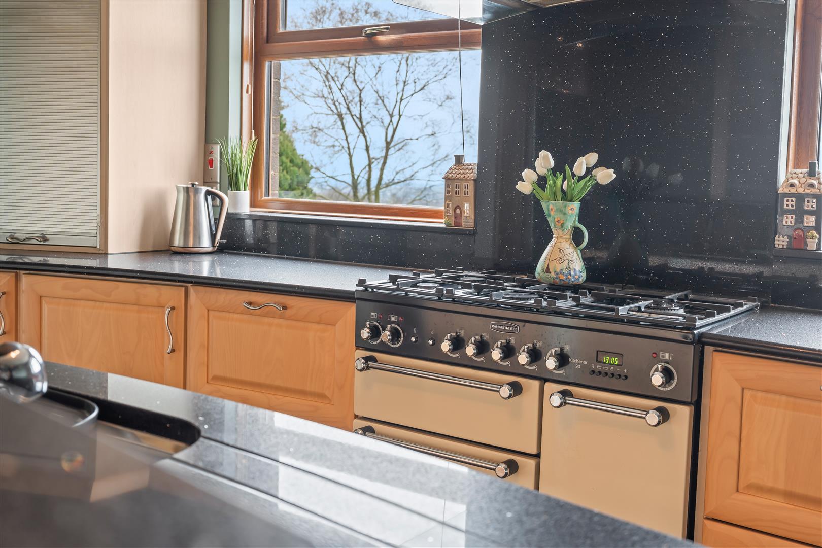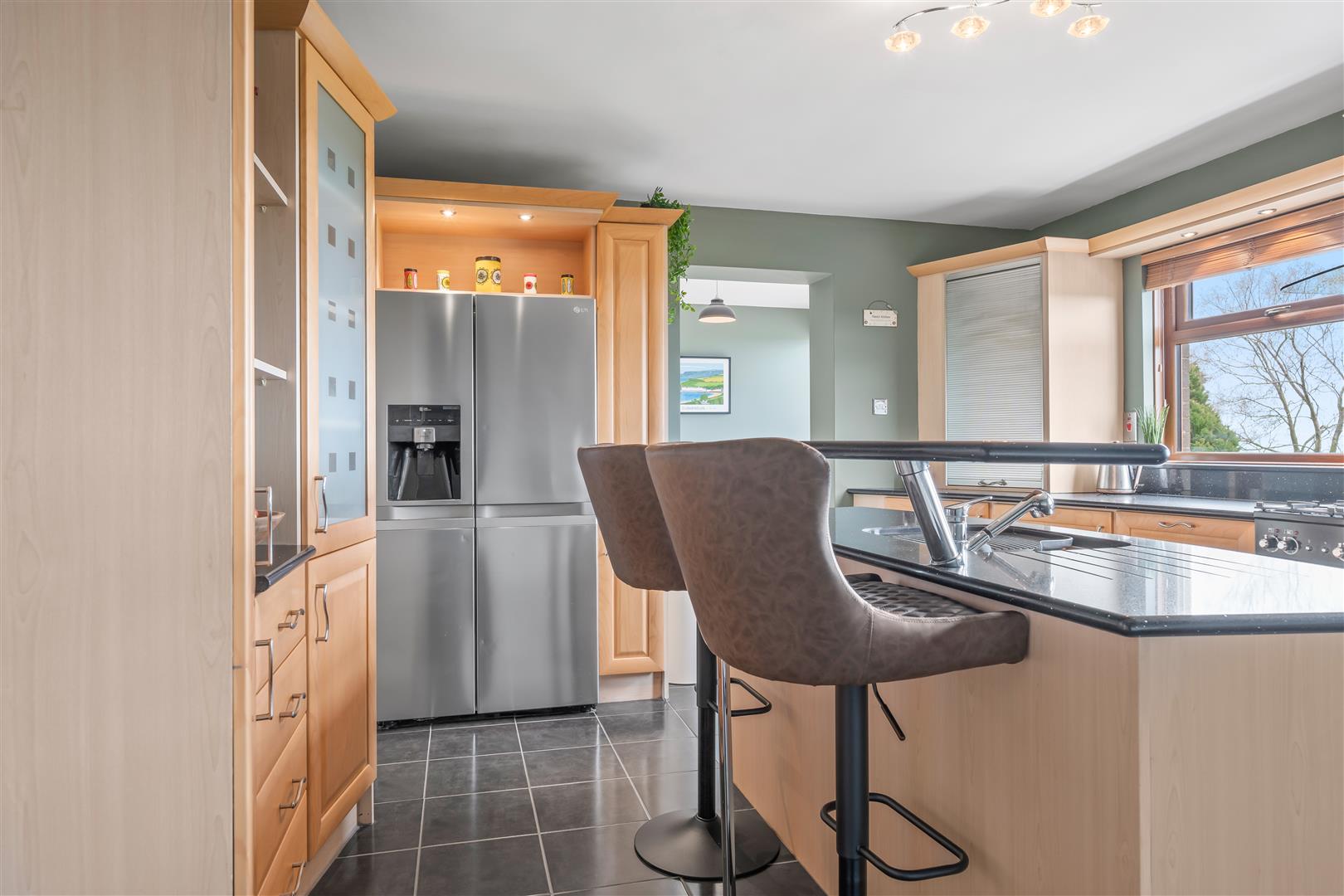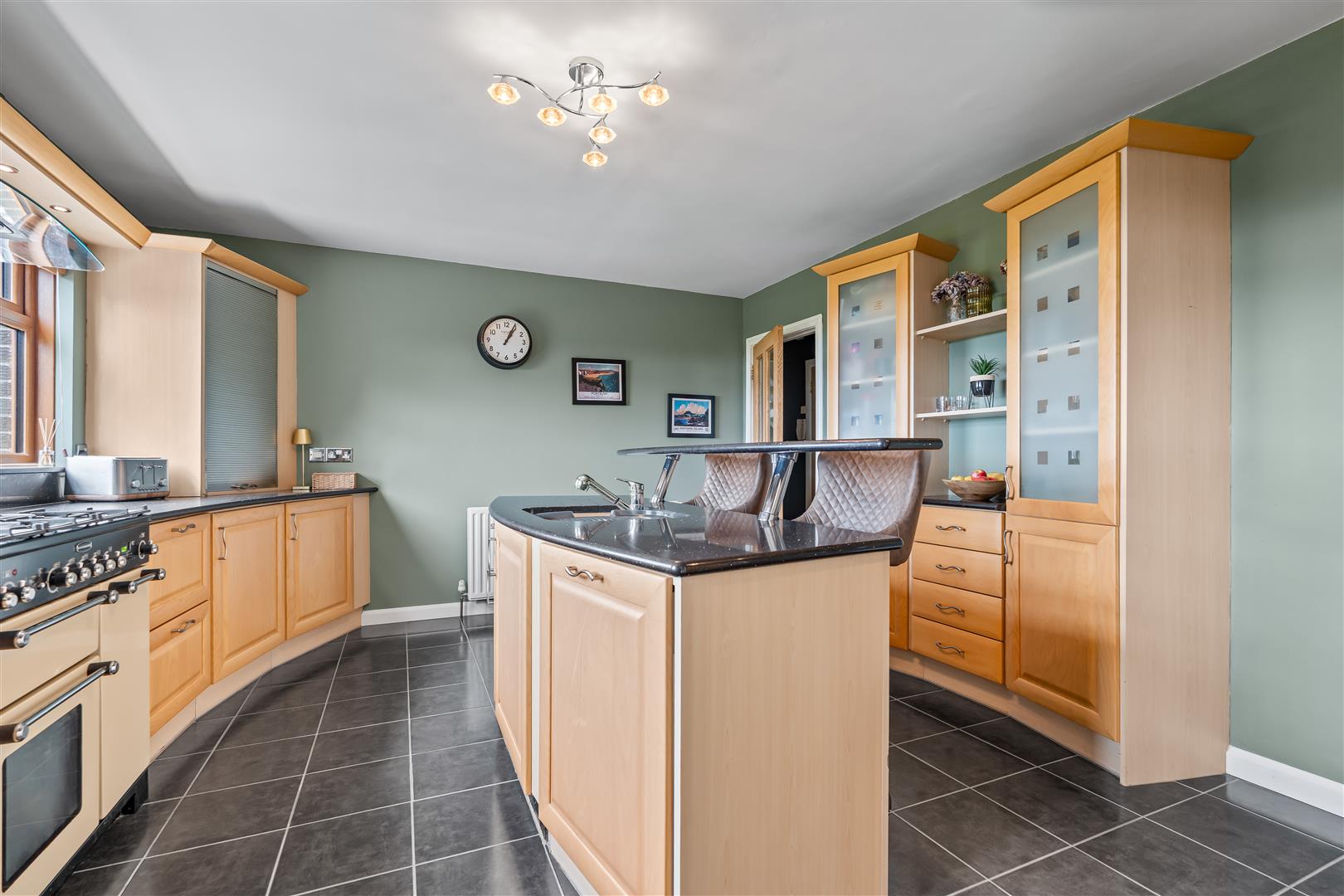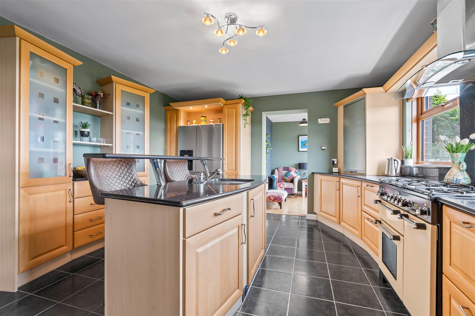 Full range of "Pearwood" effect high and low level units to include part glazed displays, open shelving and two wall mounted tambour units. Tall pull-out larder unit. Contrasting polished granite curved work surfaces, upstands and cills. Inset stainless steel sink unit with fluted granite drainer, mixer taps and retractable hose. Over window pelmet with inset lighting. Space for range style cooker (plumbed for gas) with matching polished granite splashback. Integrated dishwasher in centre island with raised breakfast shelf. Plumbed for American style fridge freezer. Kickboard heater. Fully tiled floor. Double radiator. Open square arch to: