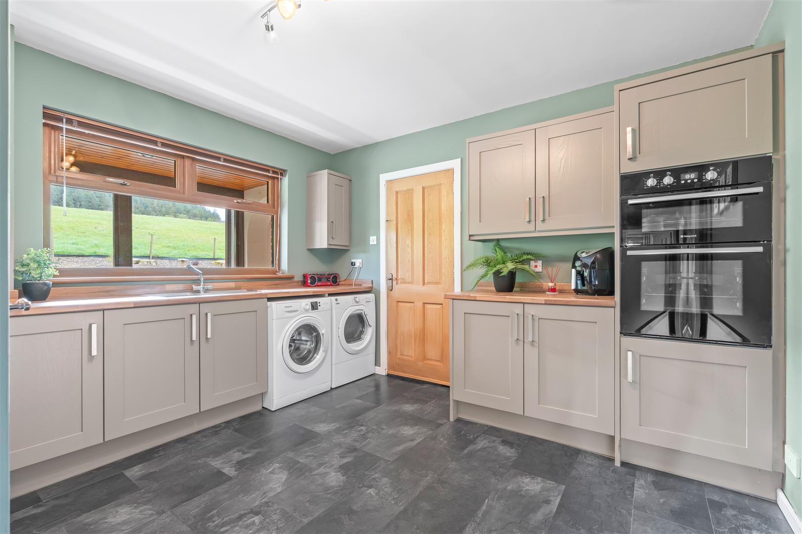 Full range of coloured "Shaker" style high and low level units with polished chrome handles and contrasting butchers block work surfaces. Single drainer stainless steel sink unit and mixer tap. Mid level double oven. Plumbed for washing machine and space for dryer. Tiled effect wood laminate floor. Single radiator. Door to integrated boiler house and insulated copper cylinder with "Willis" type immersion heater.