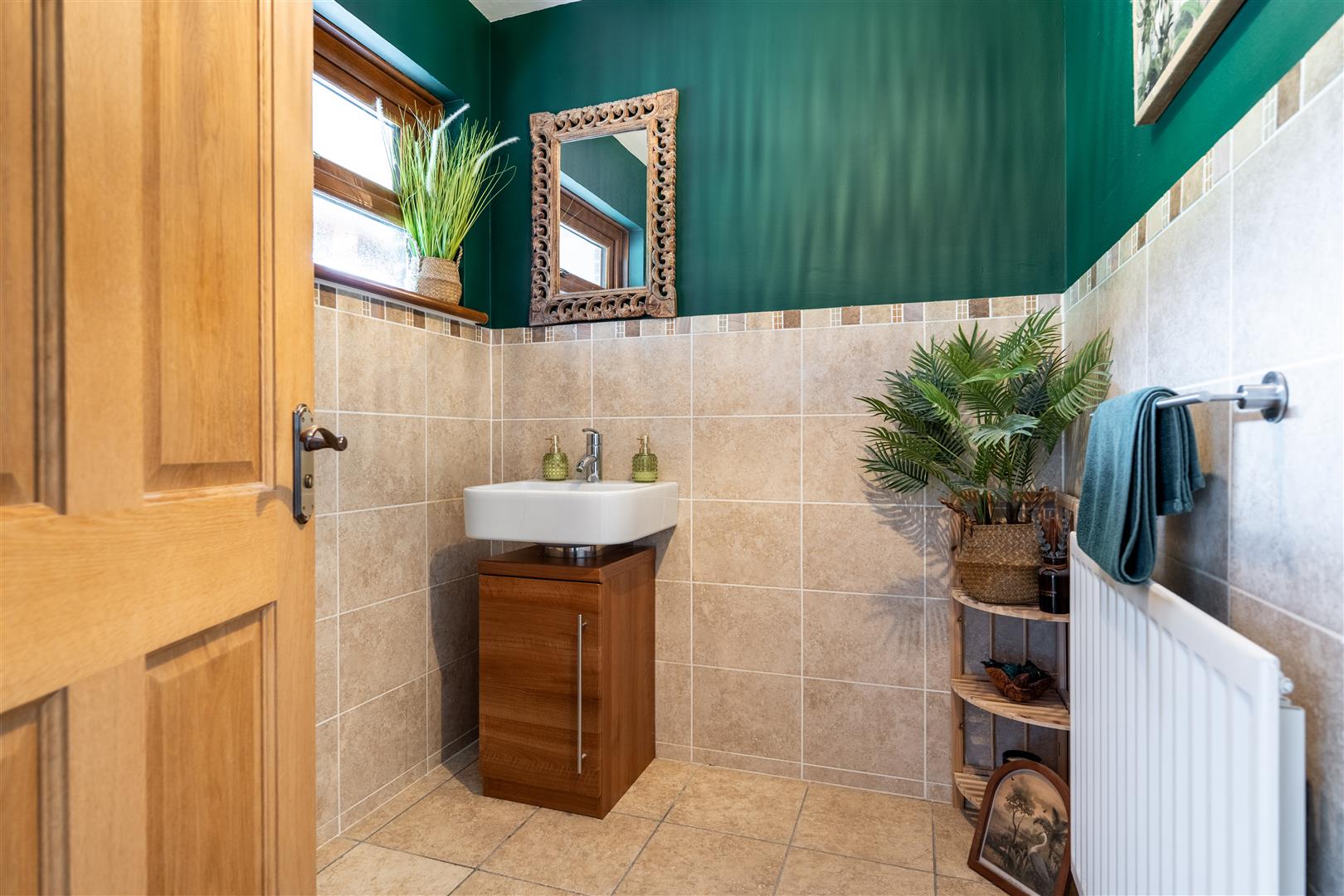 Moulded wash hand basin in vanity unit with mixer taps and storage below. Double radiator.