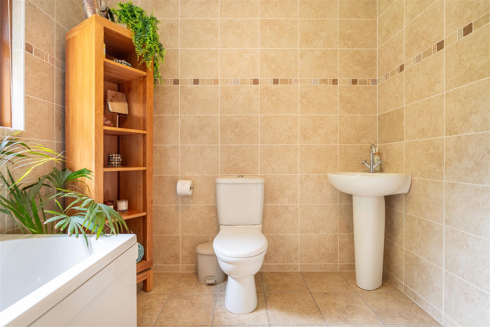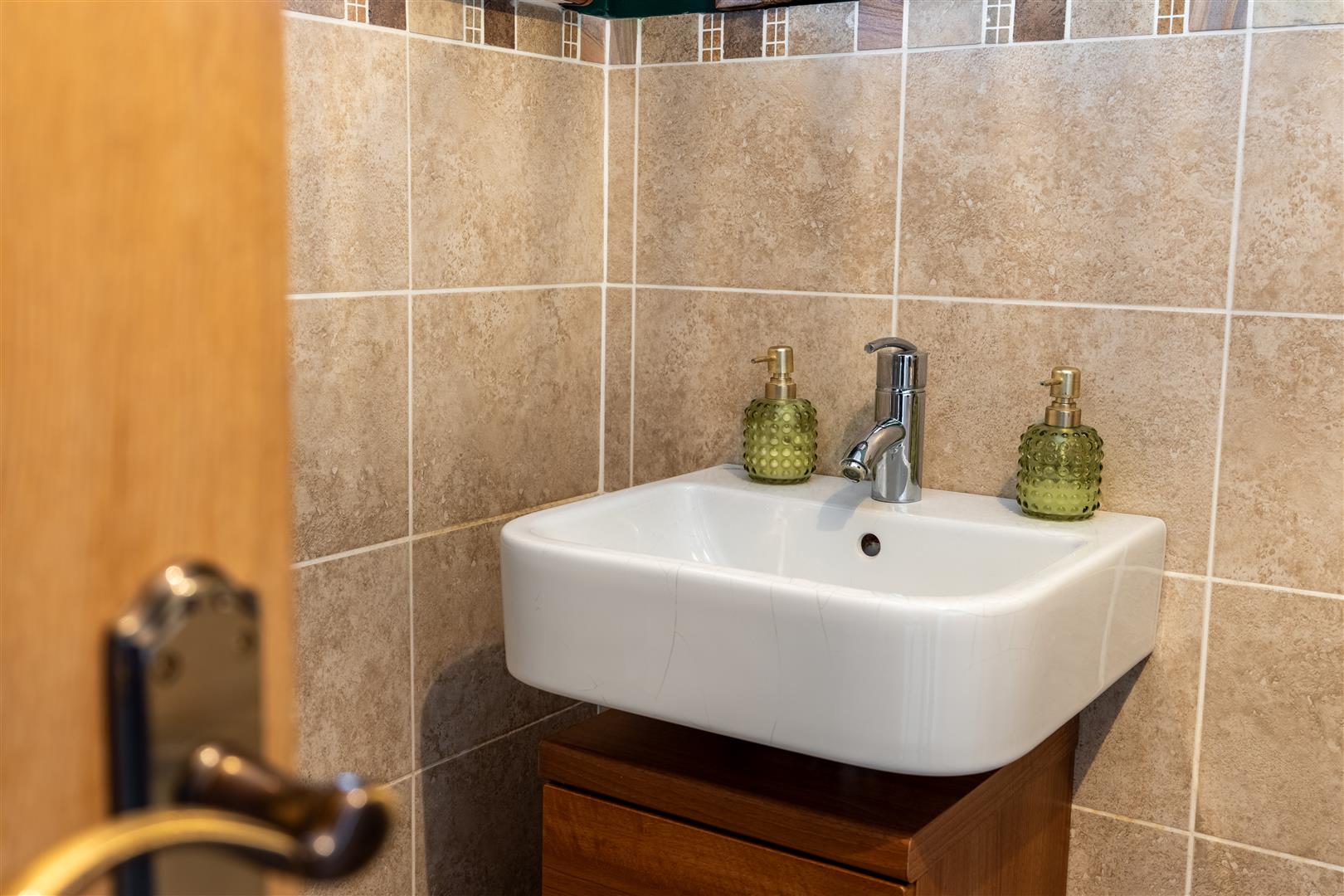 Modern white suite comprising push button low flush W/C and moulded wash hand basin in vanity with mixer taps and storage below. Half tiled walls with decorative border. Fully tiled floor. Single radiator.