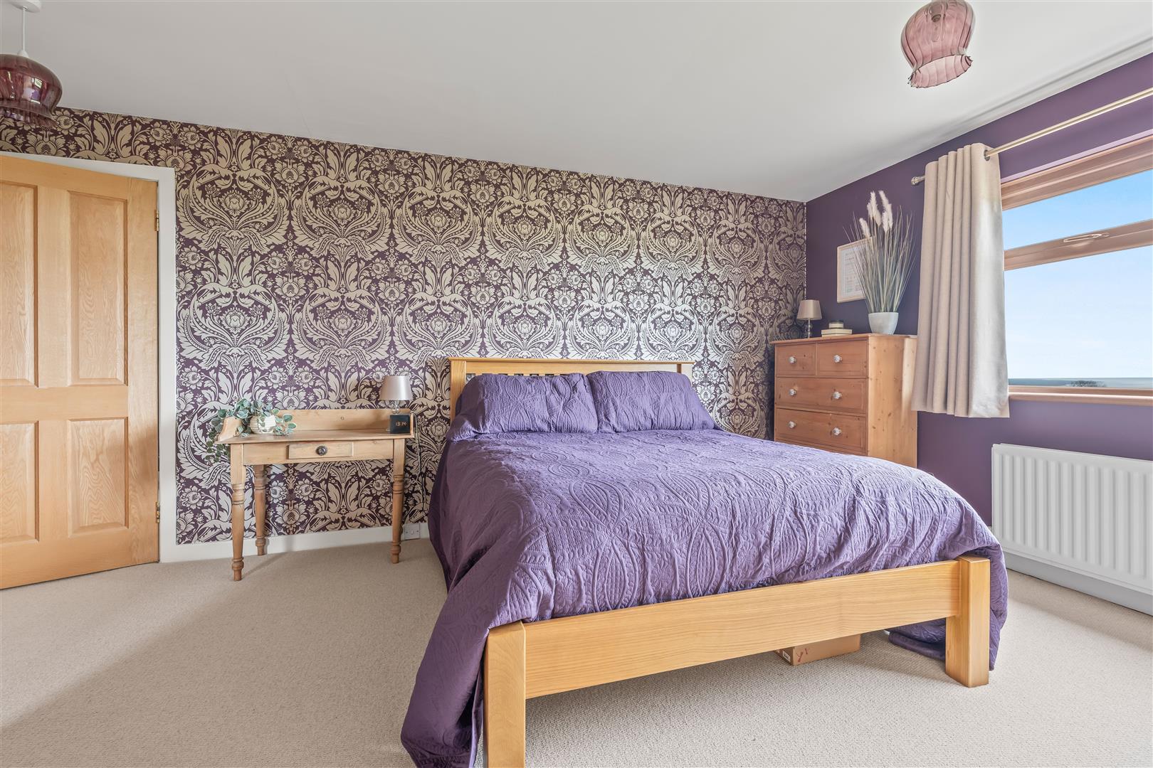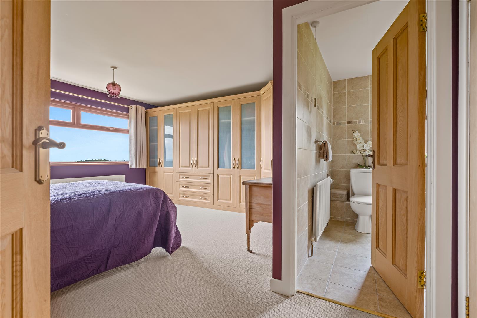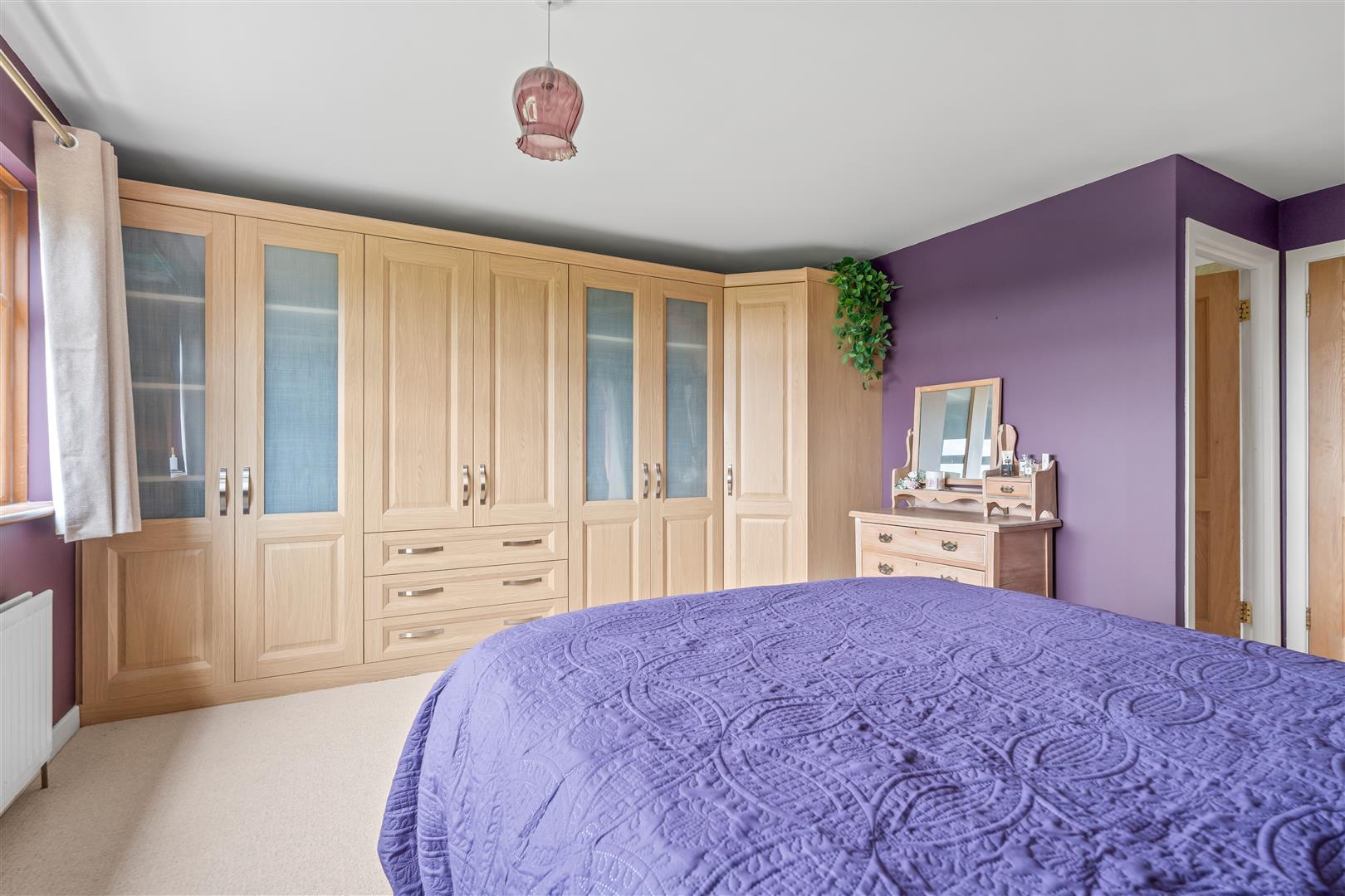 (to include both built-in wardrobes and ensuite) Full range of built-in light oak wardrobes and drawer set. Part glazed doors. Double radiator.