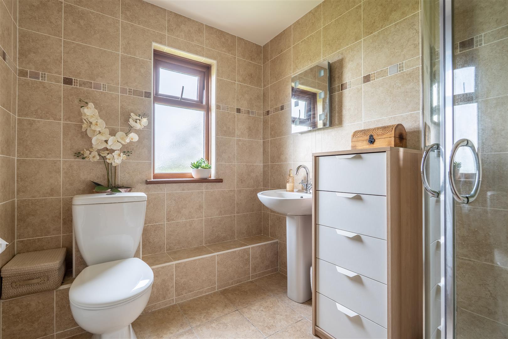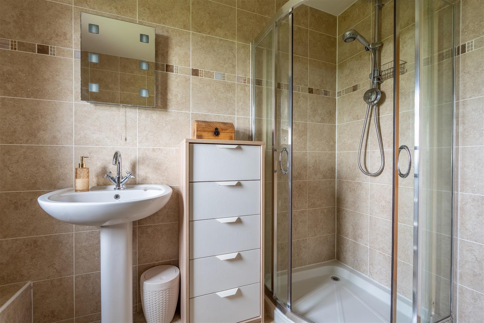 Modern white suite comprising push button low flush W/C and pedestal wash hand basin with feature tap. Fully tiled corner quadrant shower cubicle with thermostatic shower unit and glazed double doors. Fully tiled walls and floor. Gable side window. Single radiator.