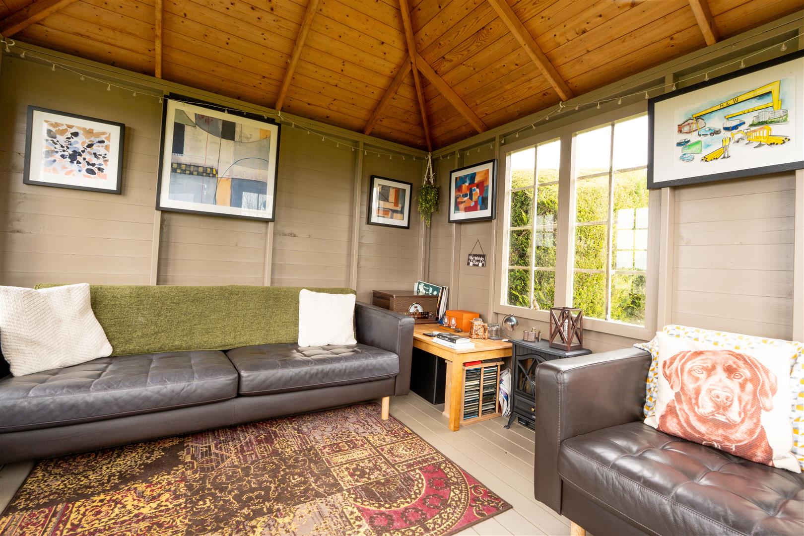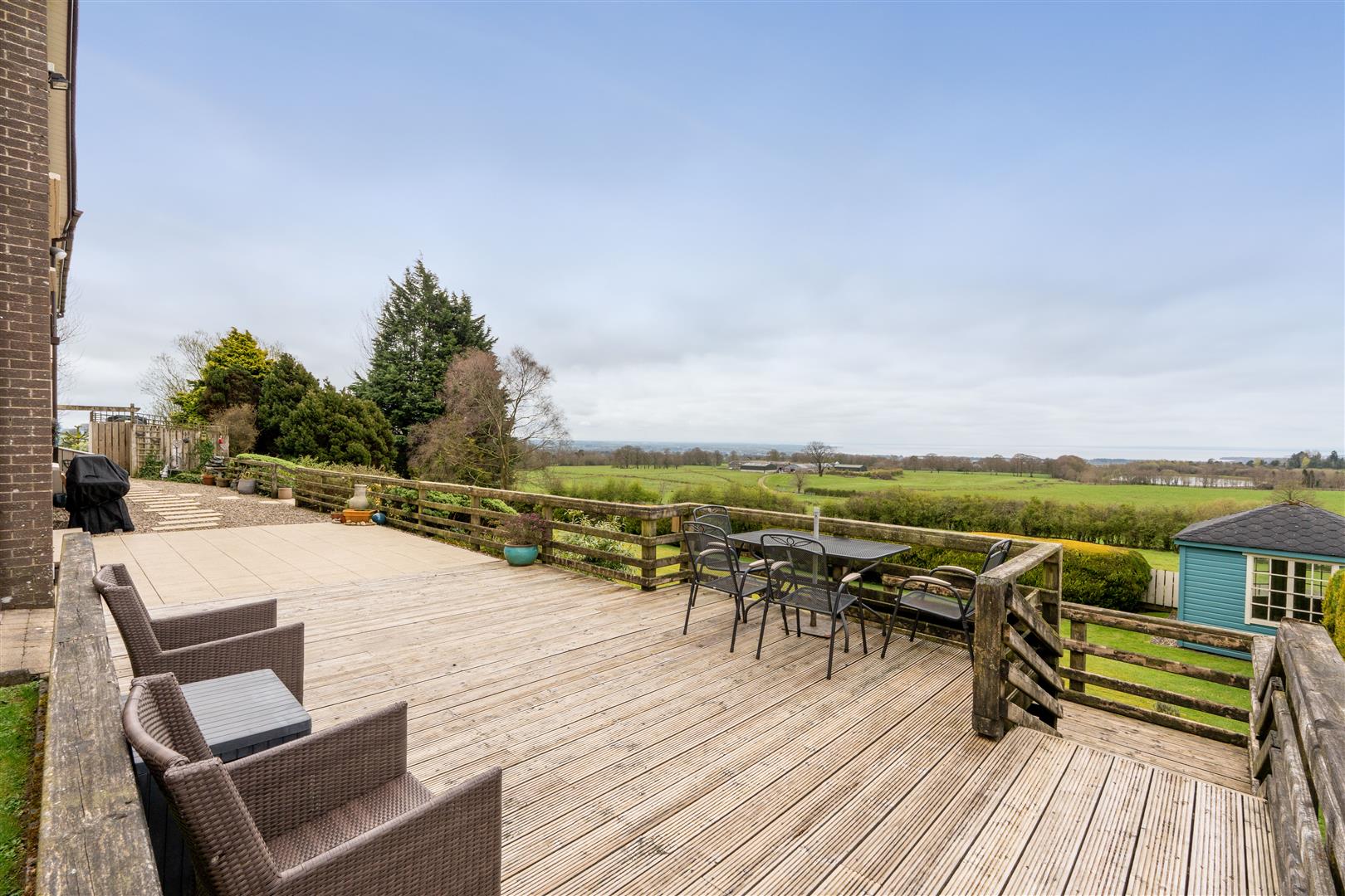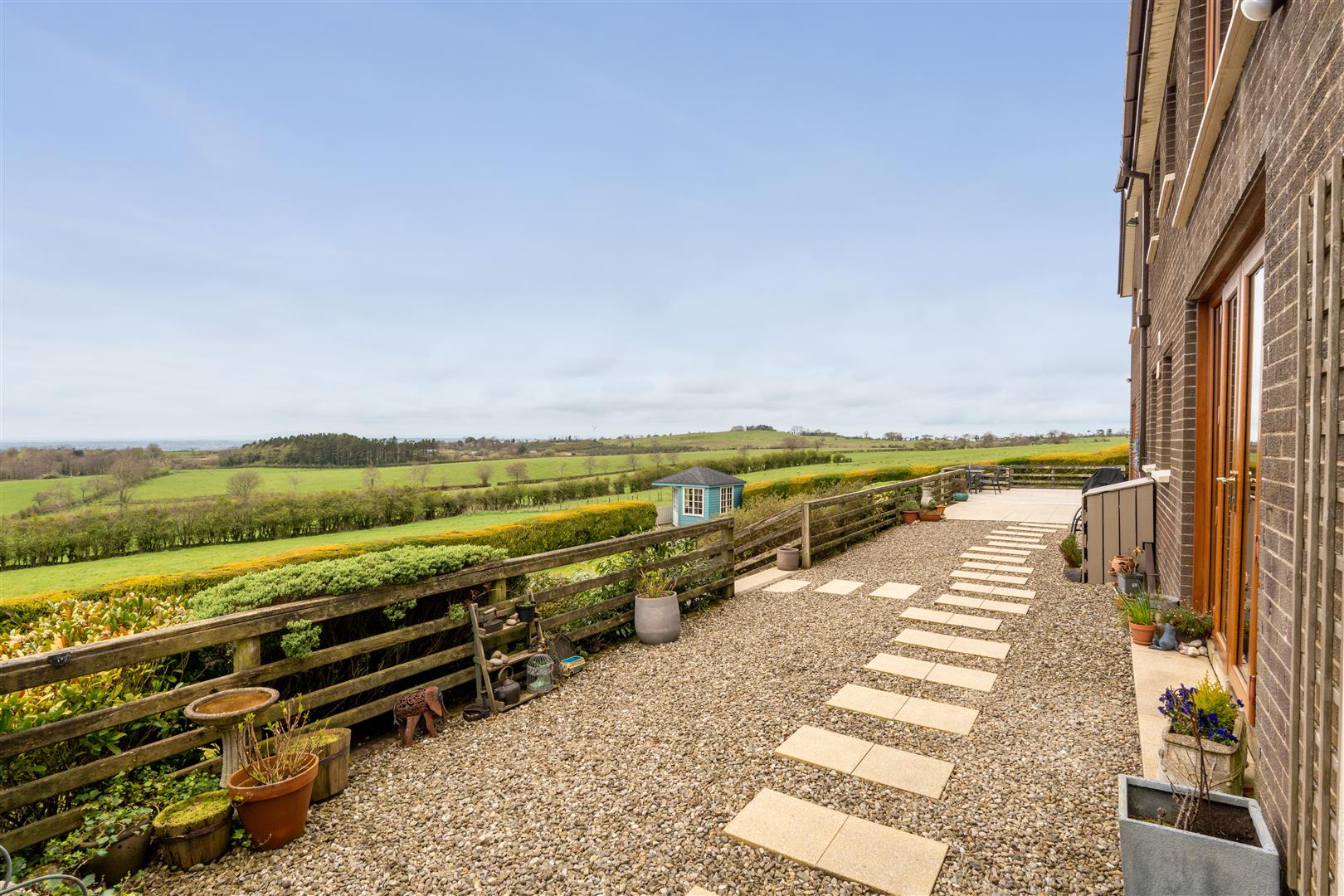 Sweeping tarmac driveway with kerbed edging and well stocked mature borders in low maintenance pebbles, conifers and shrubs. Generous parking for up to six cars with access to integral double garage. Extensive gardens to front, side and rear in neat lawn and mature trees. Low maintenance barked display. Timber enclosure for PVC oil tank and bins. Old style timber farm gate to spacious side garden with mature trees and shrubs. Timber shed 8'0 x 6'0 with low maintenance stone to the front and side. Raised timber planters. Stoned display area. Decorative stoned area to rear of house with inset paving slabs creating walkway to complimentary paved patio. Steps down to lower garden level. Open to timber decked patio with steps to lower garden level in neat lawn, mature conifer hedging and Summer House 9'0 x 9'0 with glazed windows and French doors providing superb views over the garden, surrounding fields and lough Neagh.