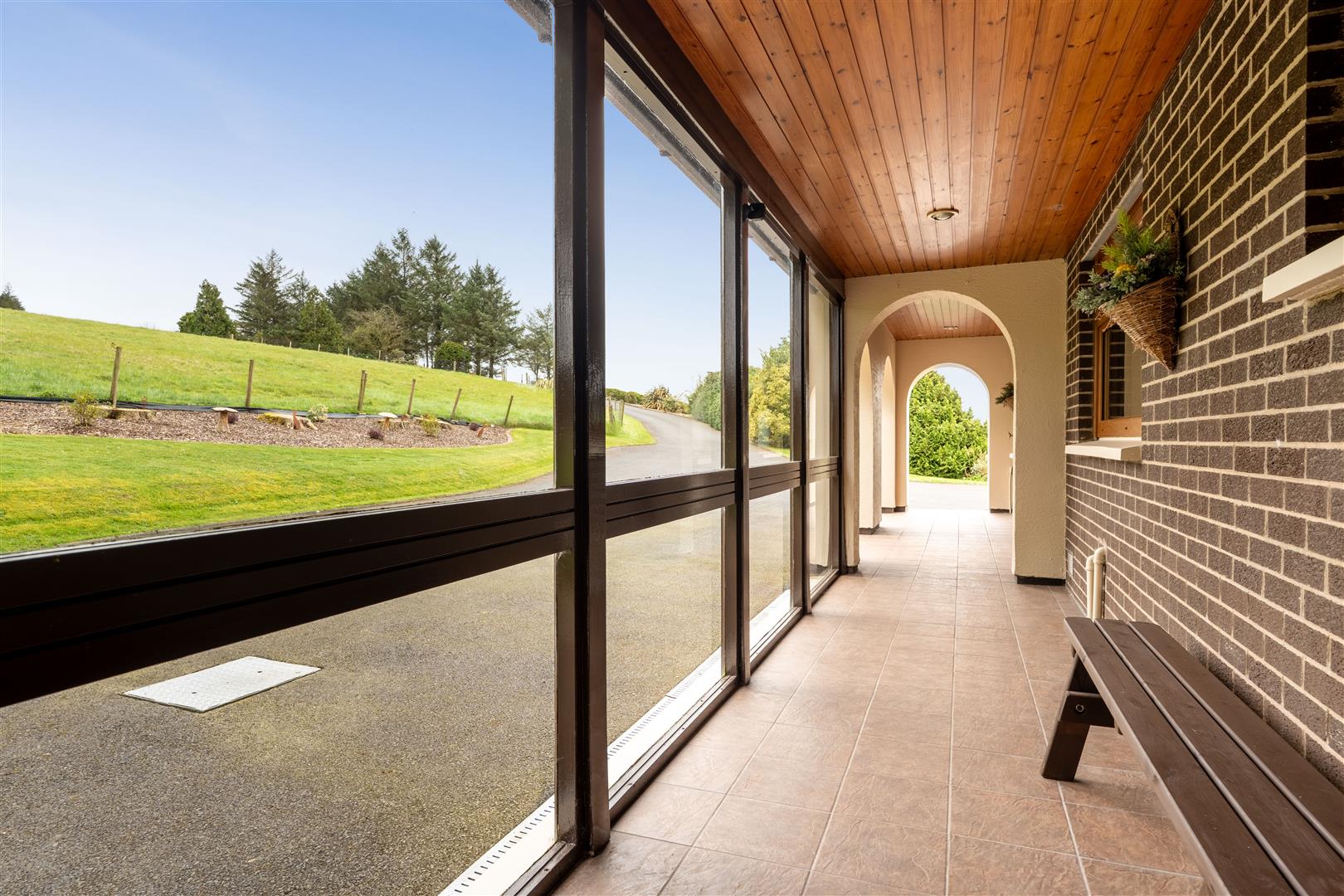 Feature partially enclosed entrance porch with floor to ceiling single glazed windows and open archway. Fully tiled floor. Wood strip ceiling. Directional spot lights. Door intercom. Wall light point. Oak effect PVC entrance door with inset double glazed leaded glass to;