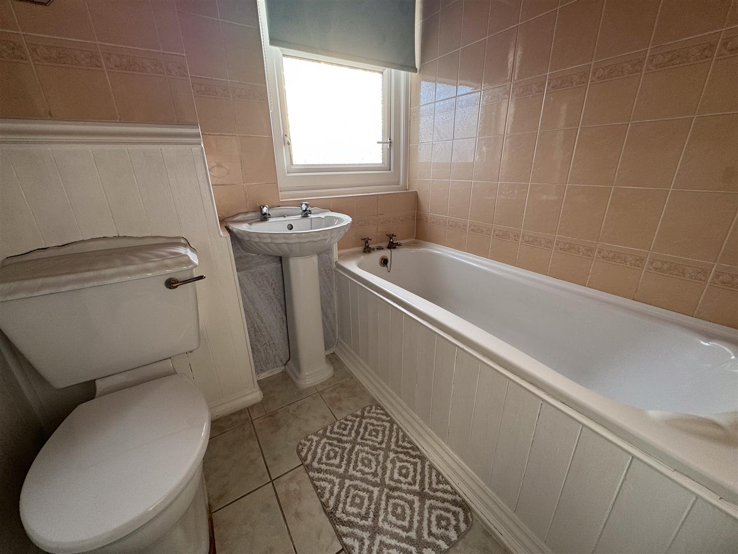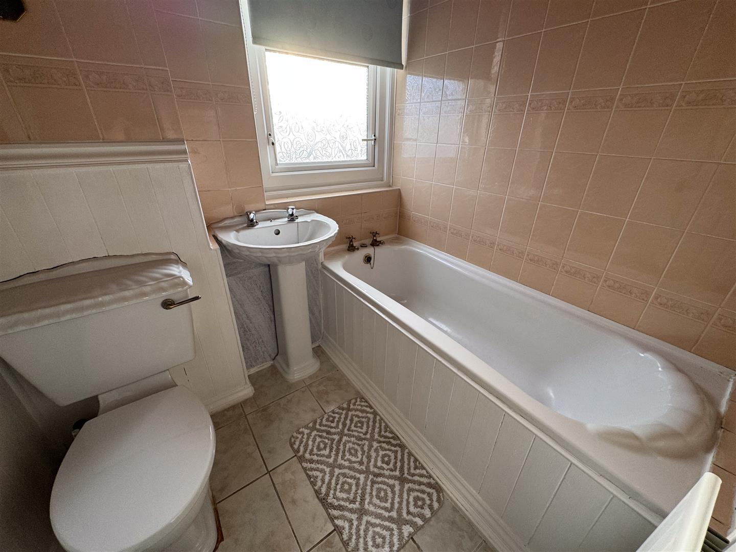 White suite comprising panelled bath, low flush W/C and pedestal wash hand basin. Fully tiled walls and floor. Wood strip ceiling. Single radiator.