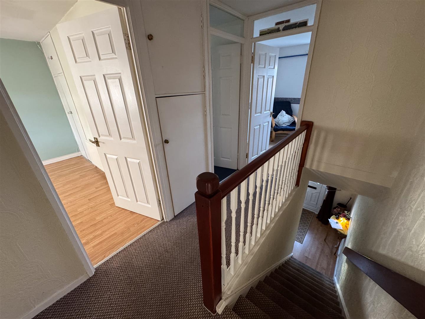 Moulded handrail and turned ballustrading. Hotpress with copper cylinder and immersion heater. Shelving above. Access to loft.