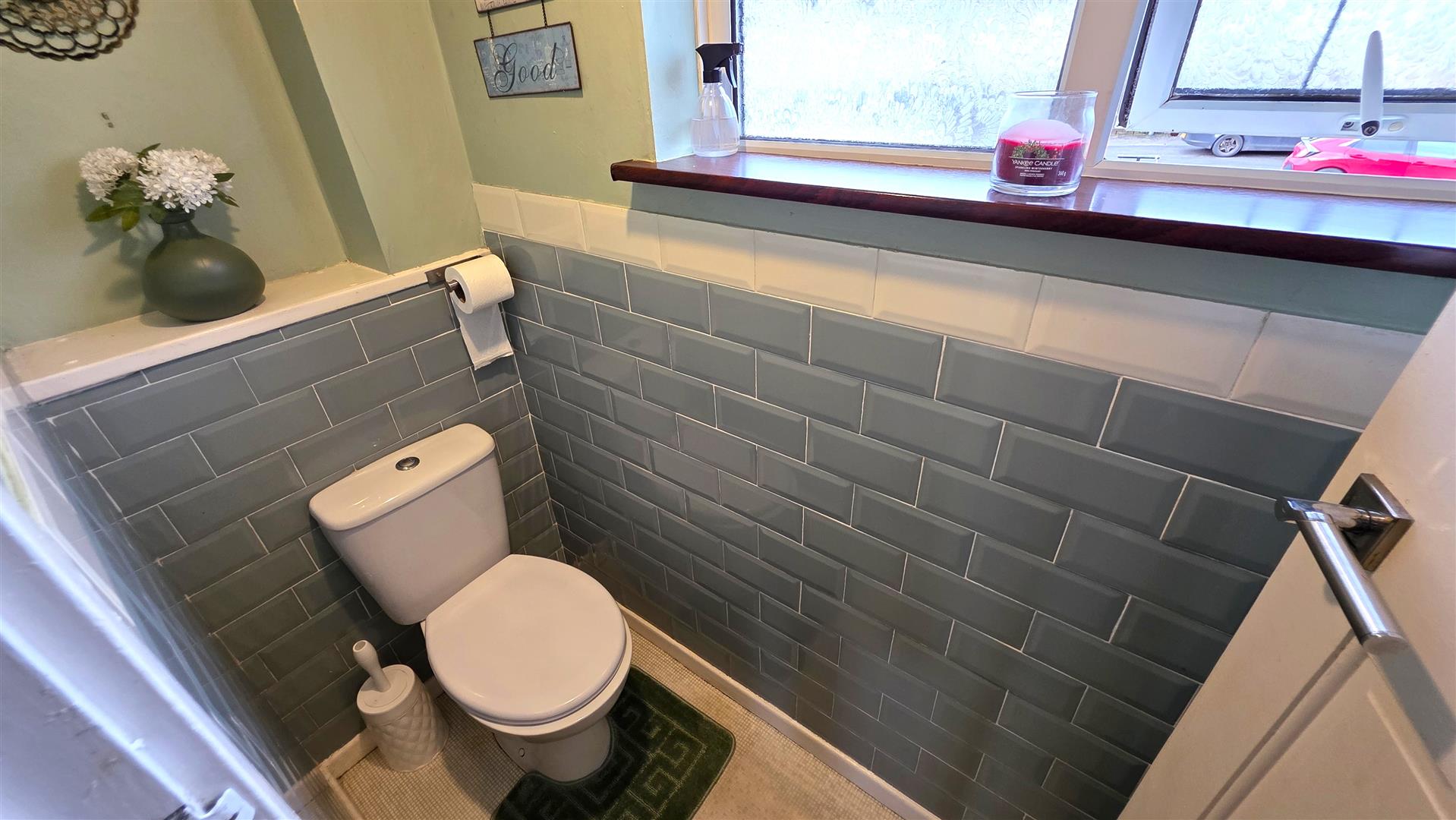 Low flush push button WC. Bevelled subway style partially tiled walls.