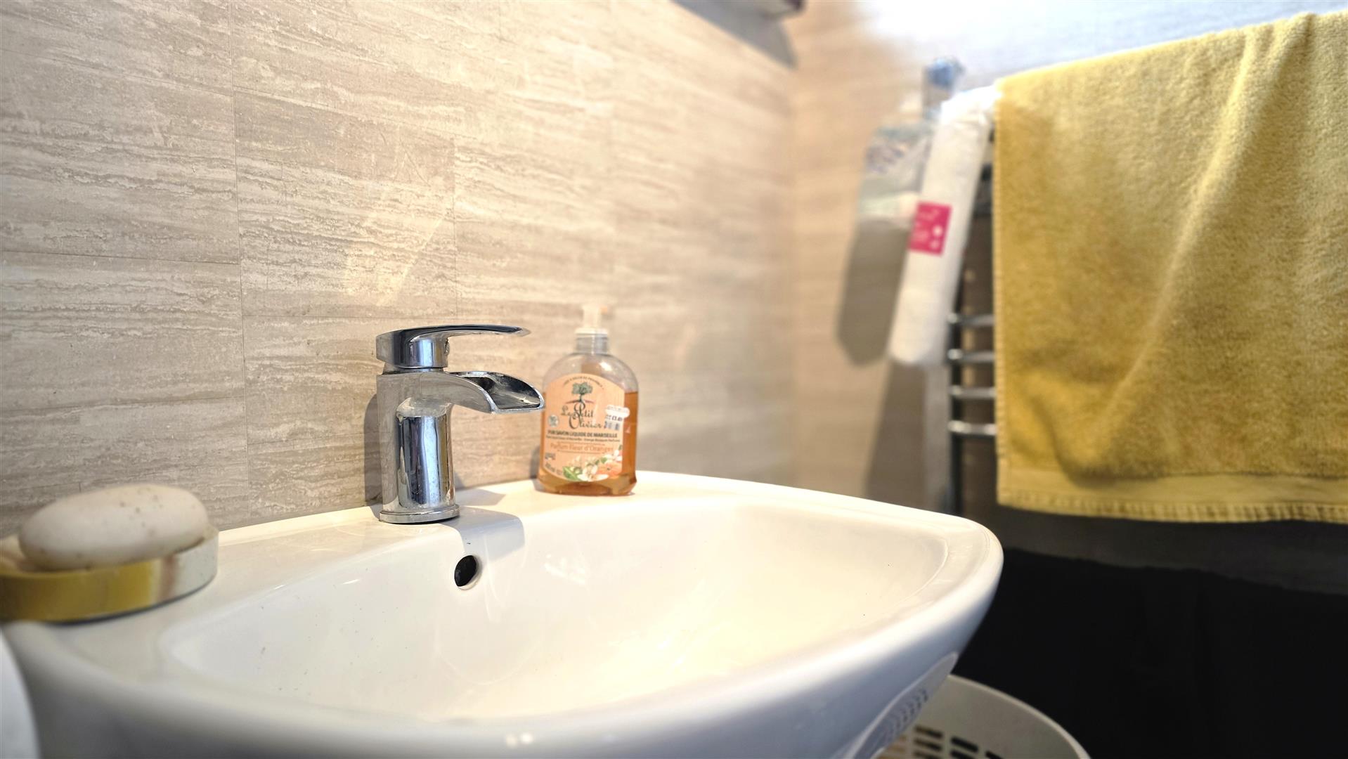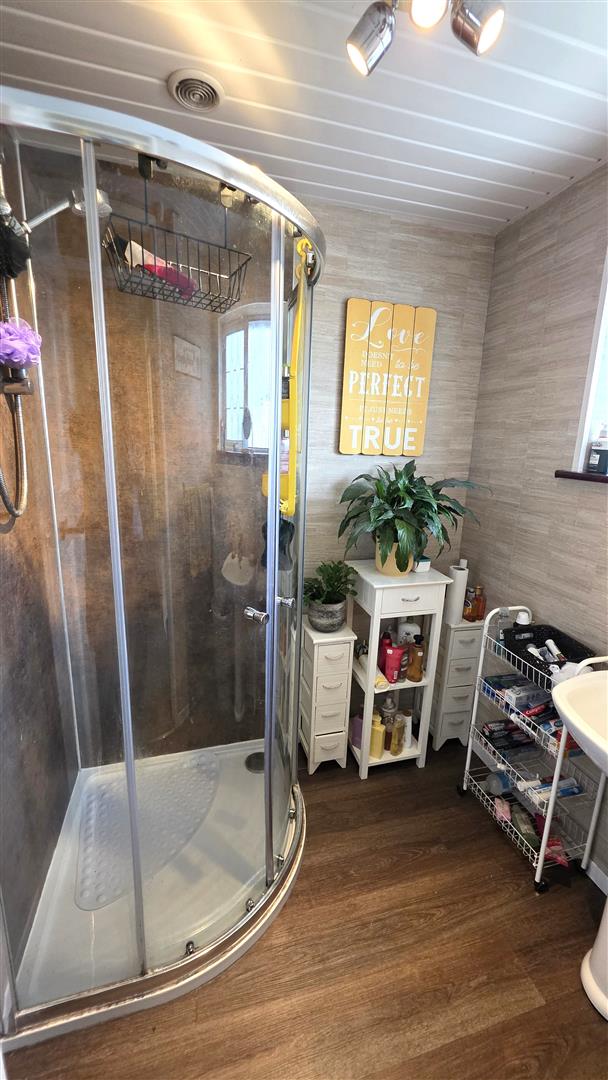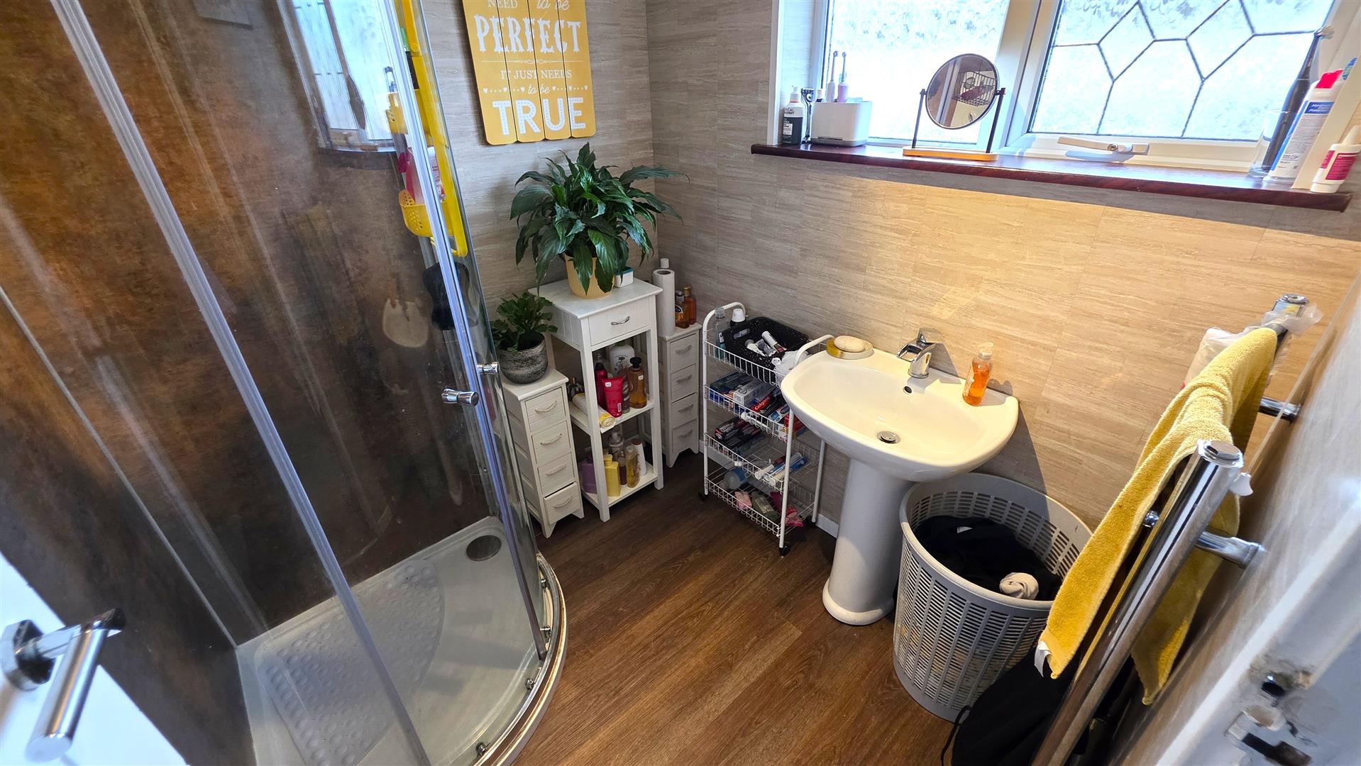 Modern white suite comprising an enclosed quadrant shower with 'Mira sport' electric shower and PVC splashback. Partially glazed sliding doors. A pedestal wash hand basin with 'Monobloc' chrome mixer tap. Wood laminate flooring. Extractor fan. Chrome towel radiator.