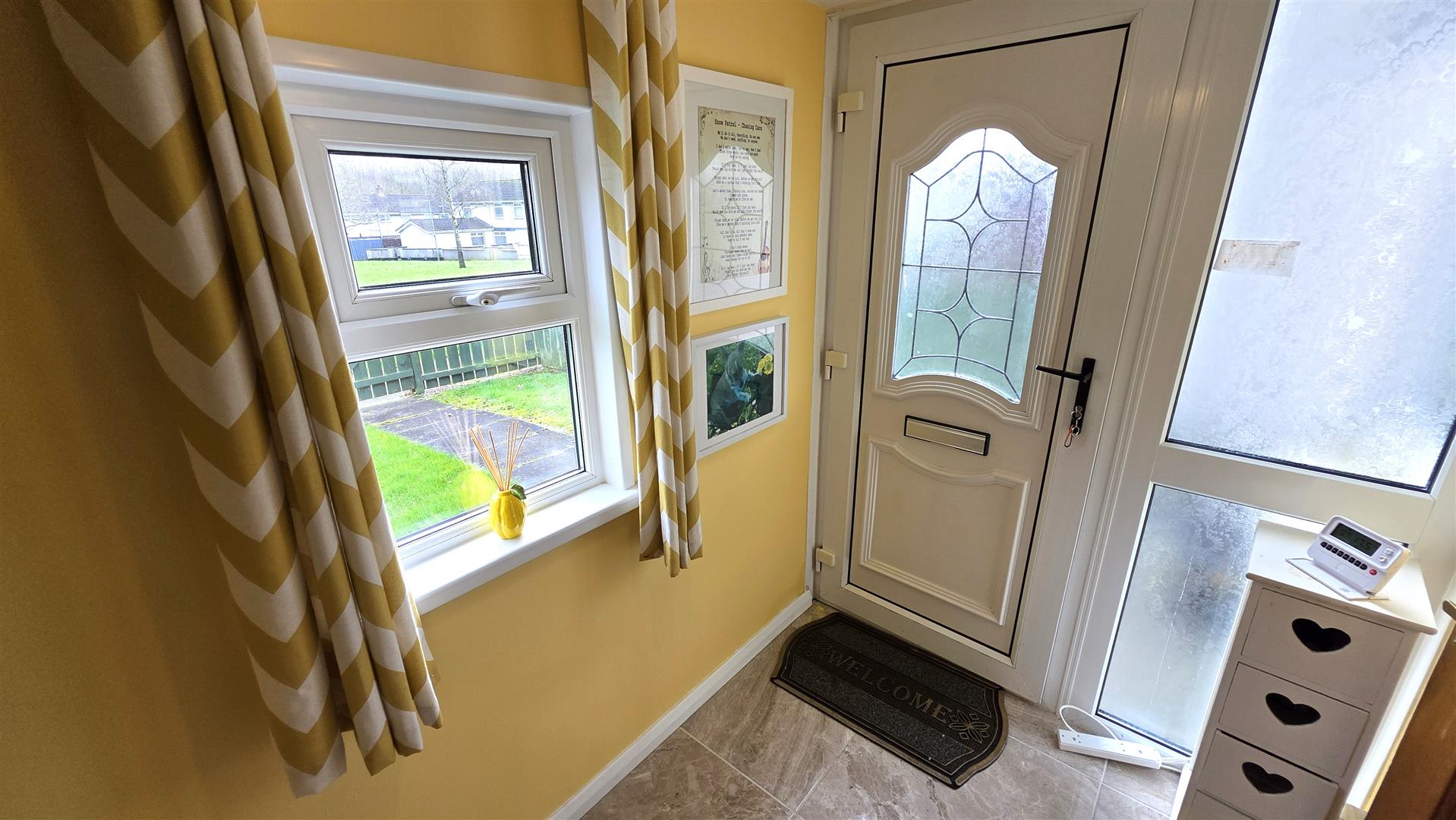 PVC door with sidelights to entrance porch. Fully tiled floor. Six pain bevelled glass door to;
