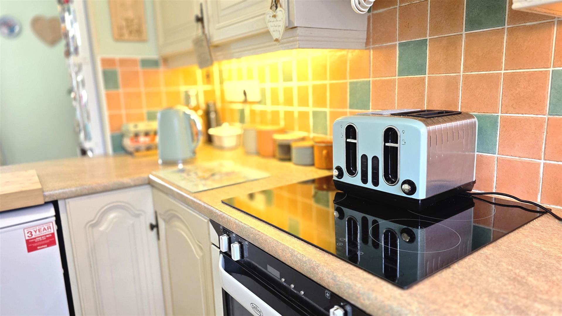 Full range of county style 'Jaos' white high and low level kitchen units with complimentary work surfaces and splash back tiling. Kitchen peninsula. One and one quarter bowl stainless steel sink unit with chrome mixer tap. Over counter lighting. Integrated appliances to include a four ring halogen hob with hooded overhead extractor fan. A low level double combination oven and grill. Space for low level fridge or other appliances. Space for fridge freezer. Fully tiled floor. Dual aspect windows. Double radiator. Arched open to;