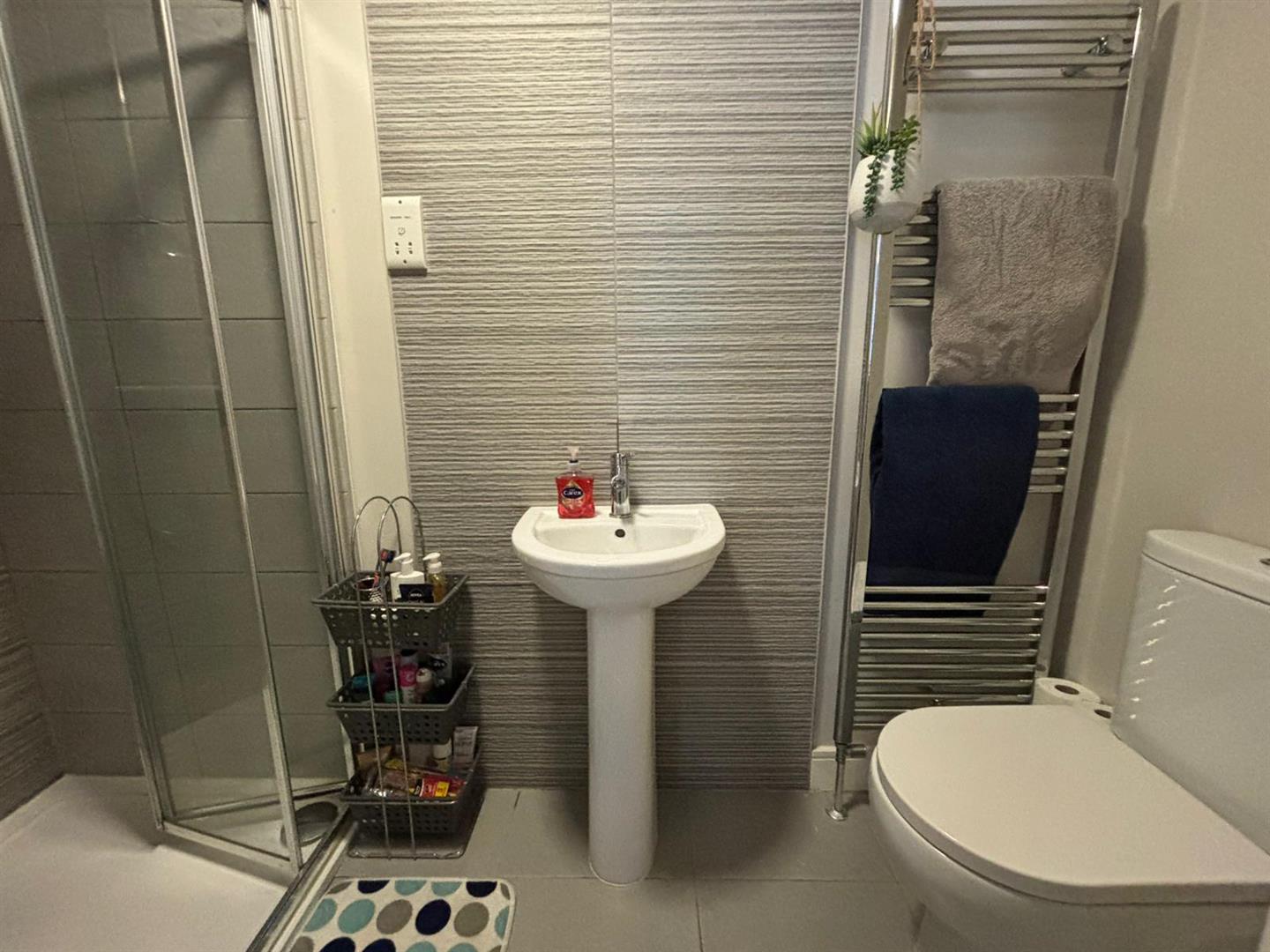 Modern white suite comprising a wall to wall shower with fully tiled walls and glazed folding screen. Pedestal wash hand basin with 'monobloc' chrome mixer tap and tiled splashback. Low flush push button WC. Fully tiled floor. Extractor fan. Chrome towel radiator.