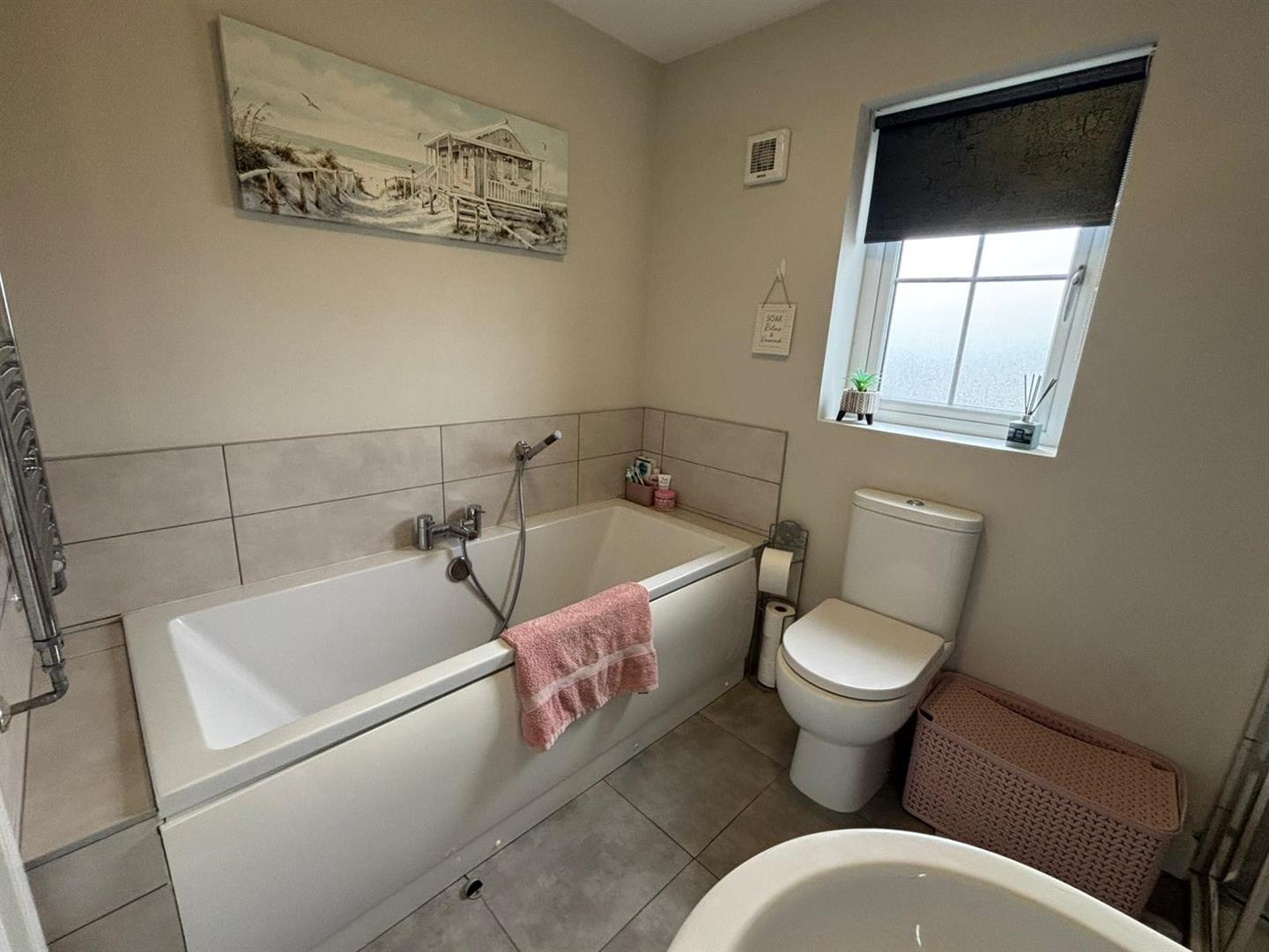 Modern white four piece suite, comprising a double ended panel bath with tiled splashback, chrome mixer tap and pencil shower head attached. Wall to wall enclosed shower with fully tiled splashback and partially glazed folding door. Pedestal wash hand basin with 'monobloc' chrome mixer tap and floor to ceiling tiled splashback. Low flush push button WC. Fully tiled floor. Extractor fan. Chrome towel radiator.