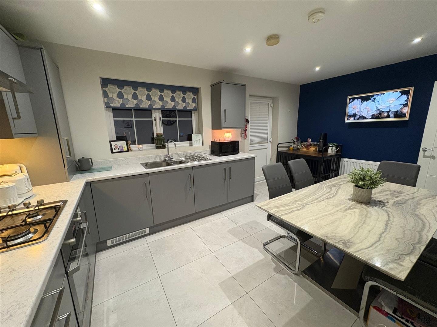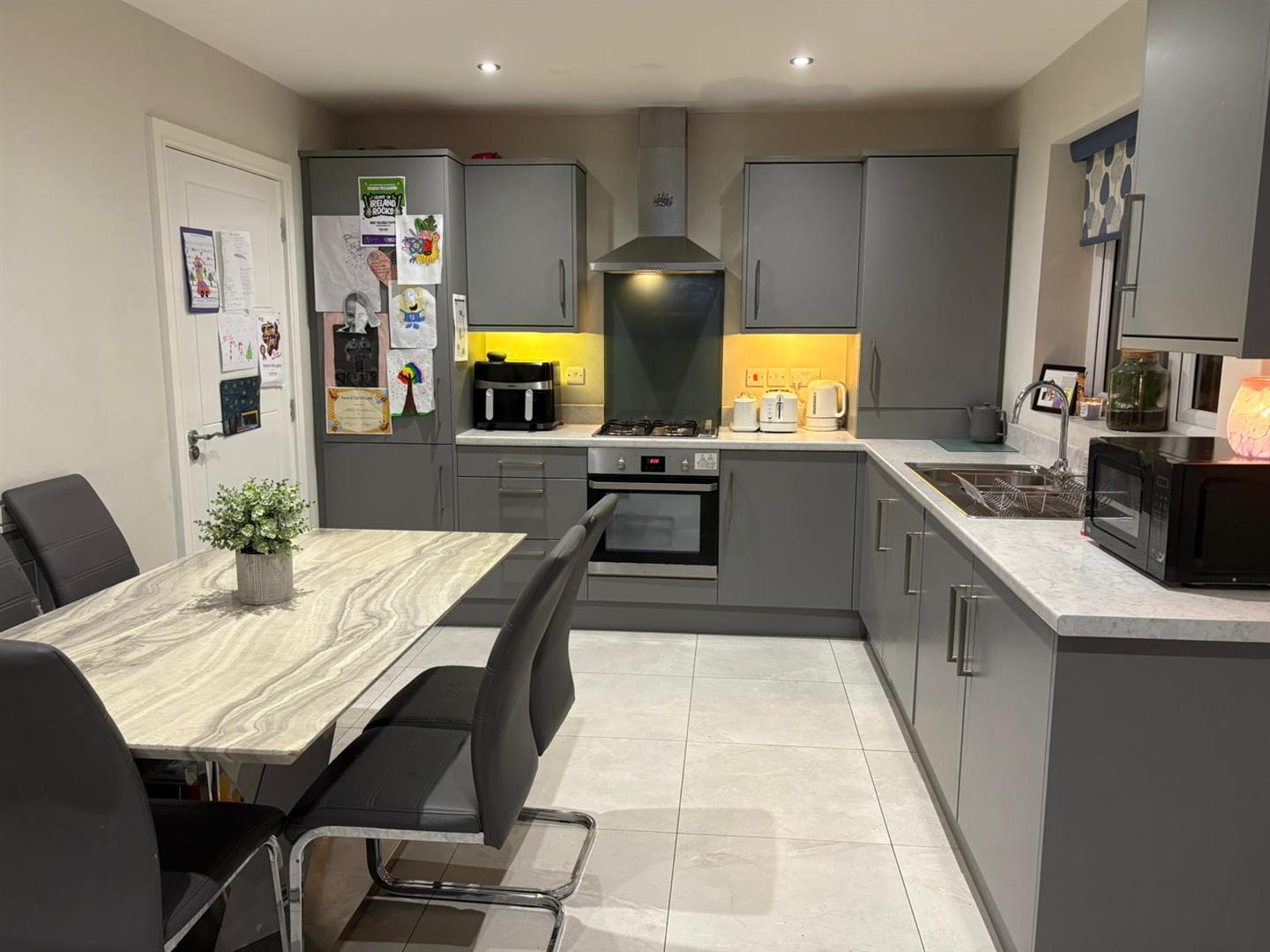 Full range of grey contemporary style, high and low level kitchen units with contrasting work surfaces and splashback stands. Over counter lighting. Full range of integrated appliances to include a four ring gas hob, with glass splashback and stainless steel pyramid style overhead extractor fan. Fridge freezer. Low level combination oven and grill, washing machine and tumble dryer. Fully tiled floor. Understairs storage. Low voltage down lighting. Double radiator.