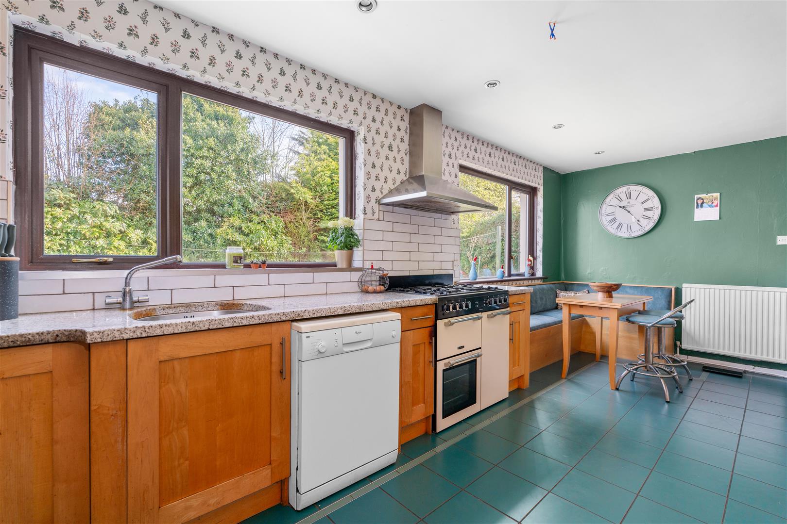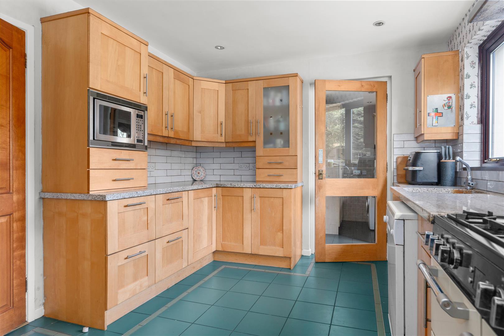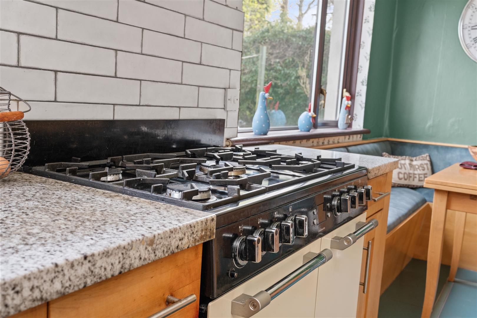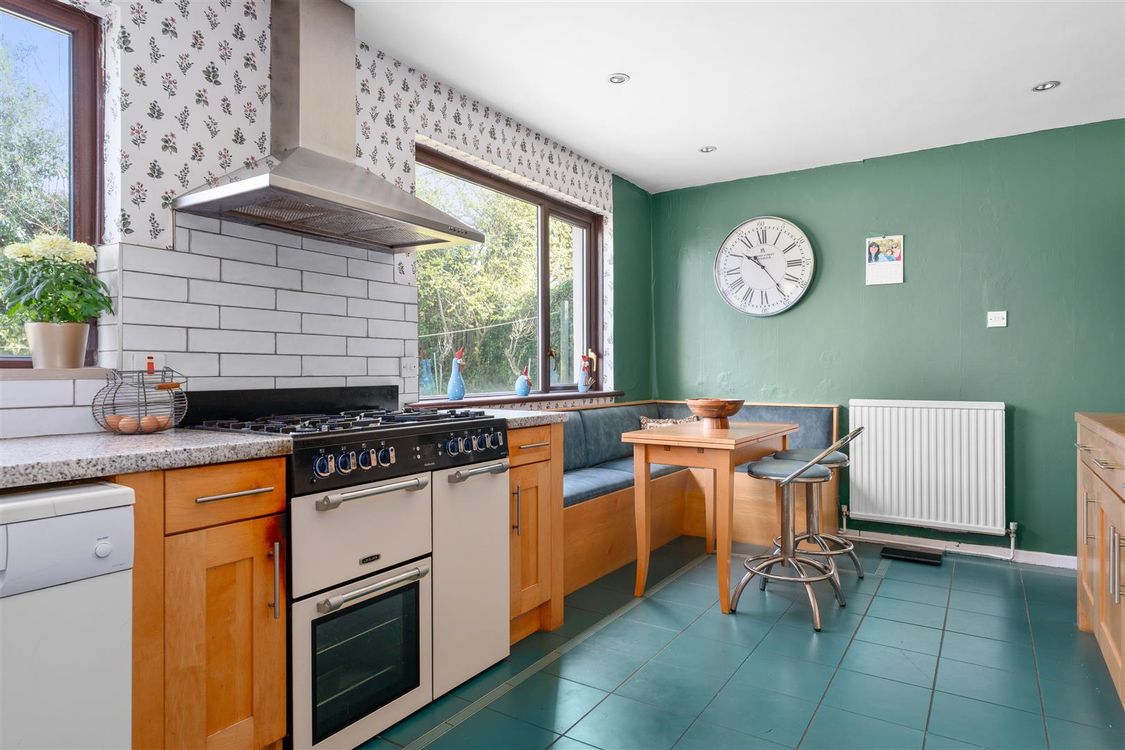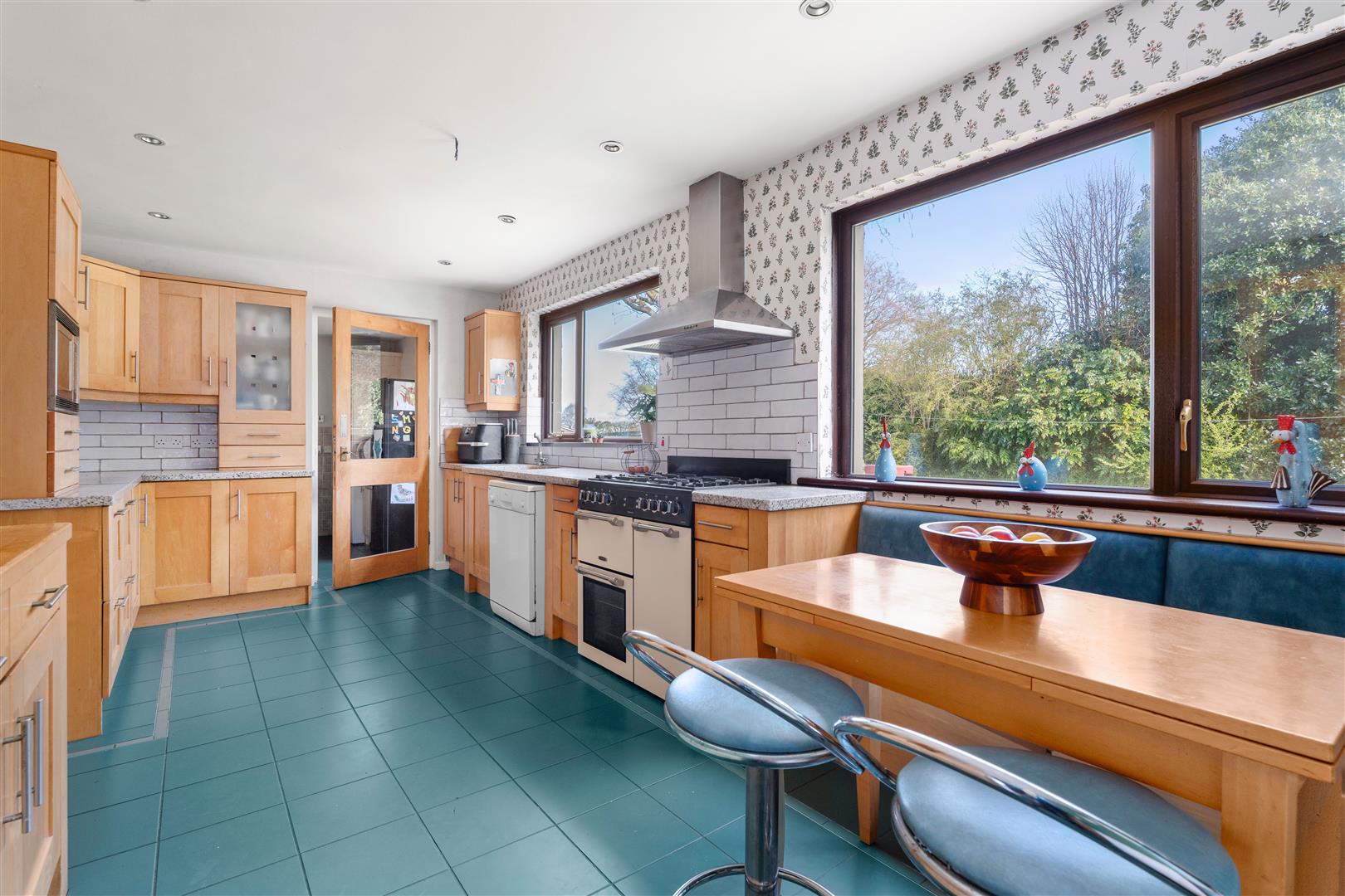 Full range of Beech "Shaker" style high and low level units with short chrome handles, glazed opaque displays, open shelving and quartz work surfaces. Stainless steel sink unit and inset drainer. Space for range style cooker with overhead extractor fan. Part tiled walls to work surfaces. Imitation bench style seating to dining. Fully tiled floor. Low voltage downlights. Mostly glazed door to: