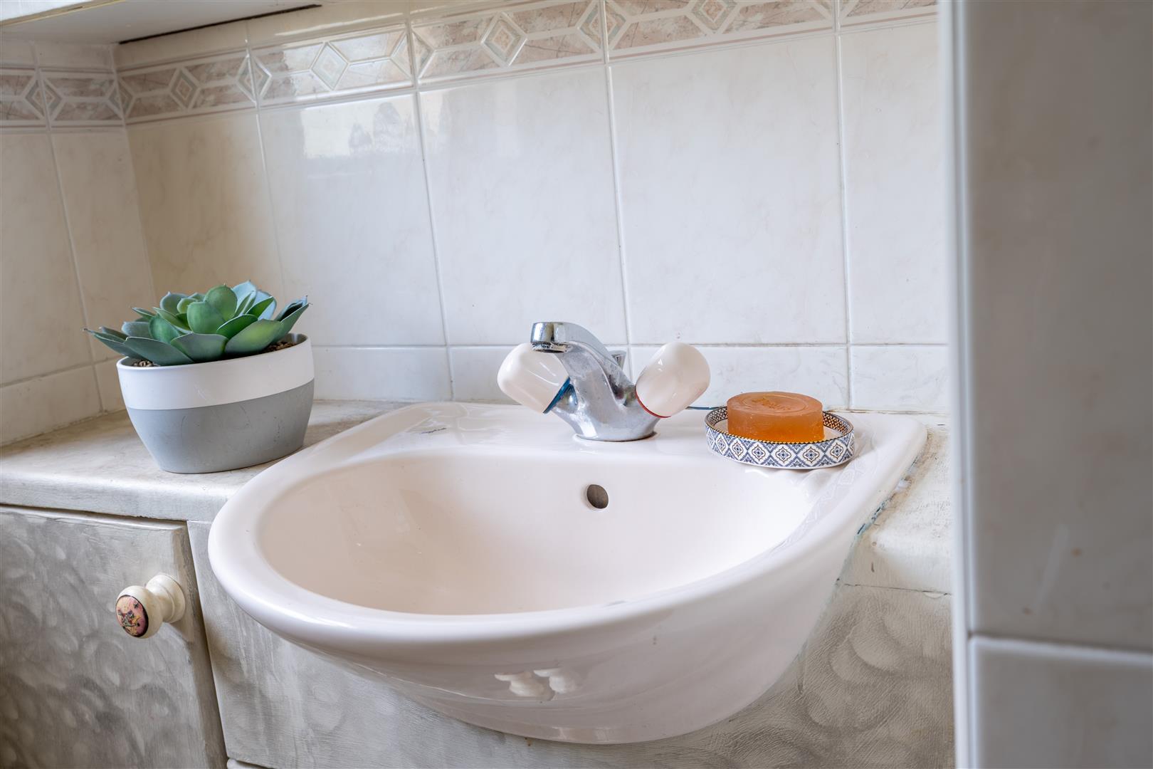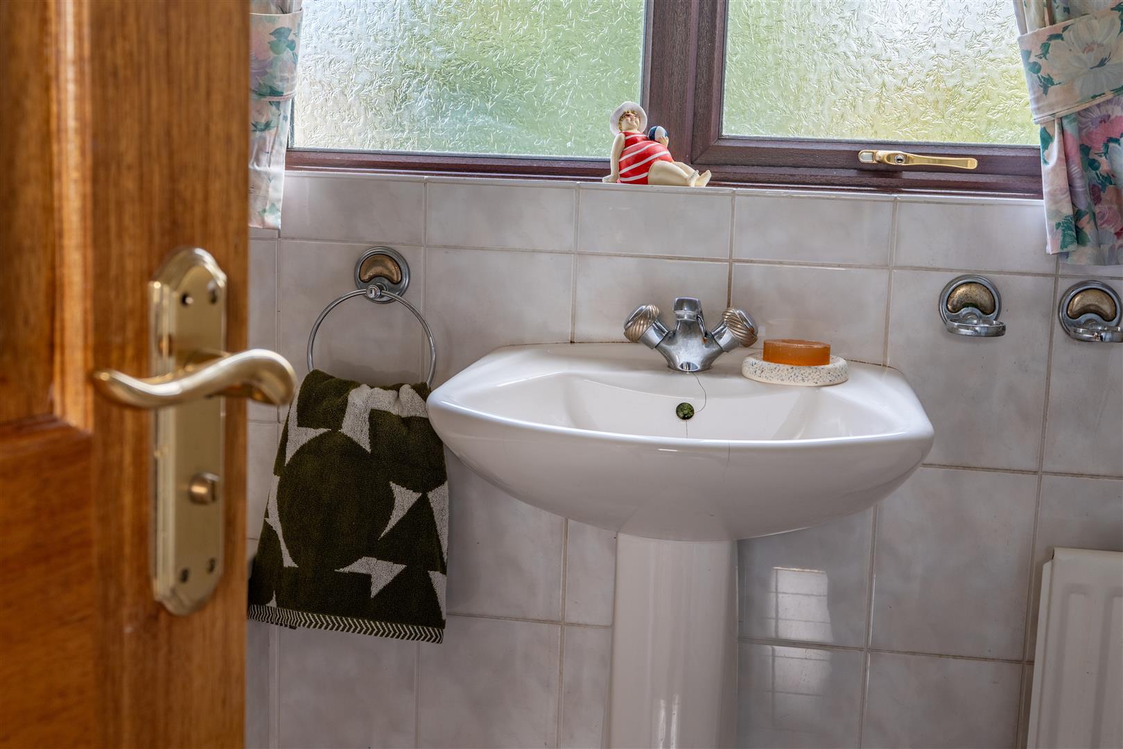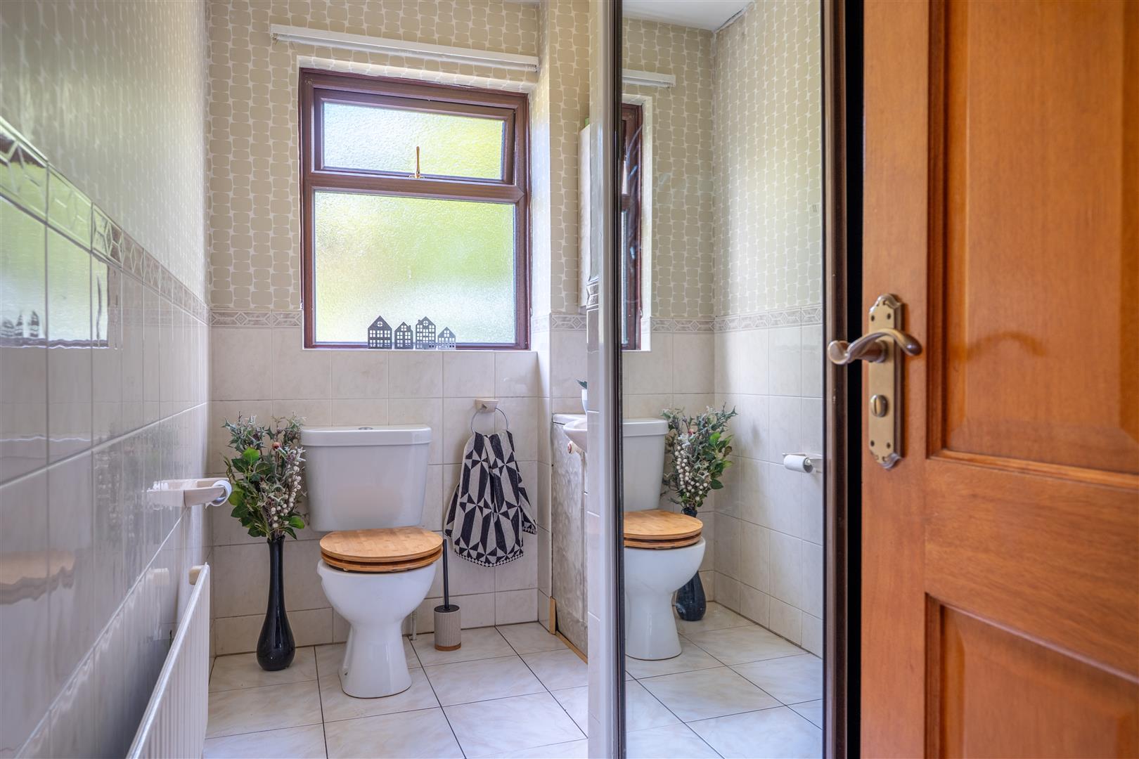 White suite comprising push button low flush W/C, inset moulded wash hand basin with mixer taps, storage above and below. Sliding mirrored doors to built-in cloaks storage. Part tiled walls. Fully tiled floor. Single radiator.