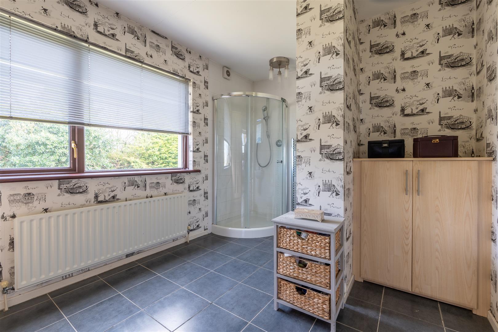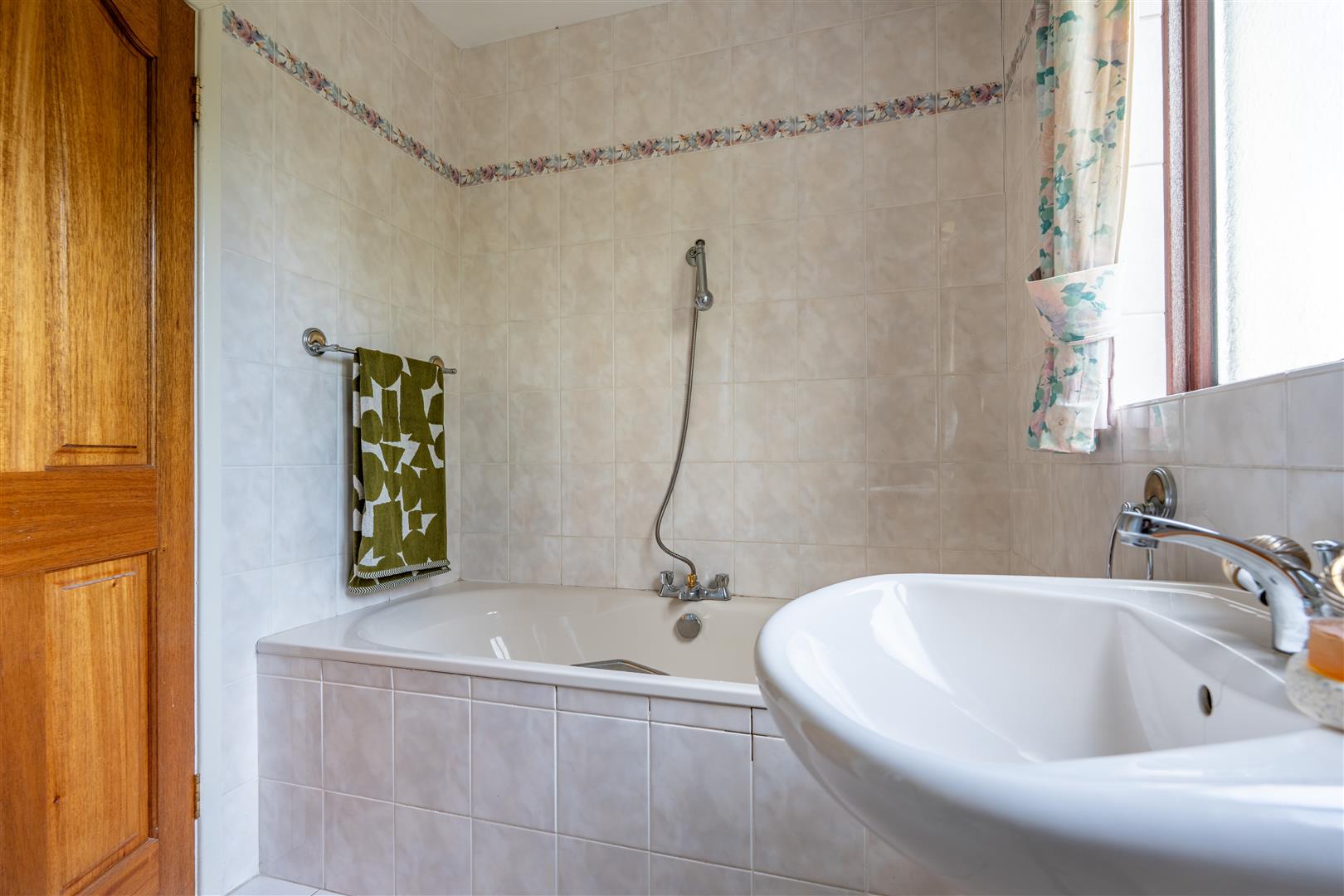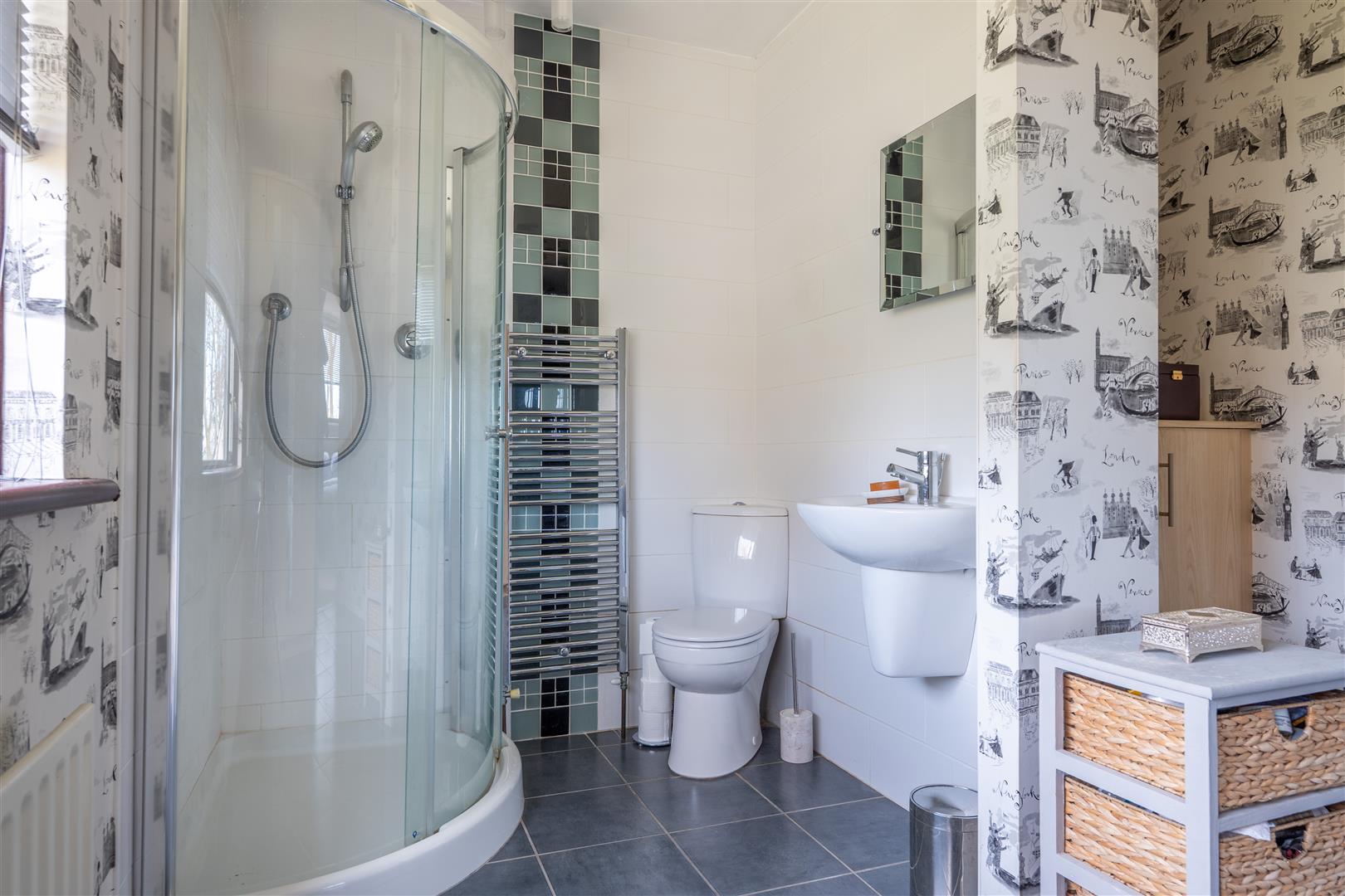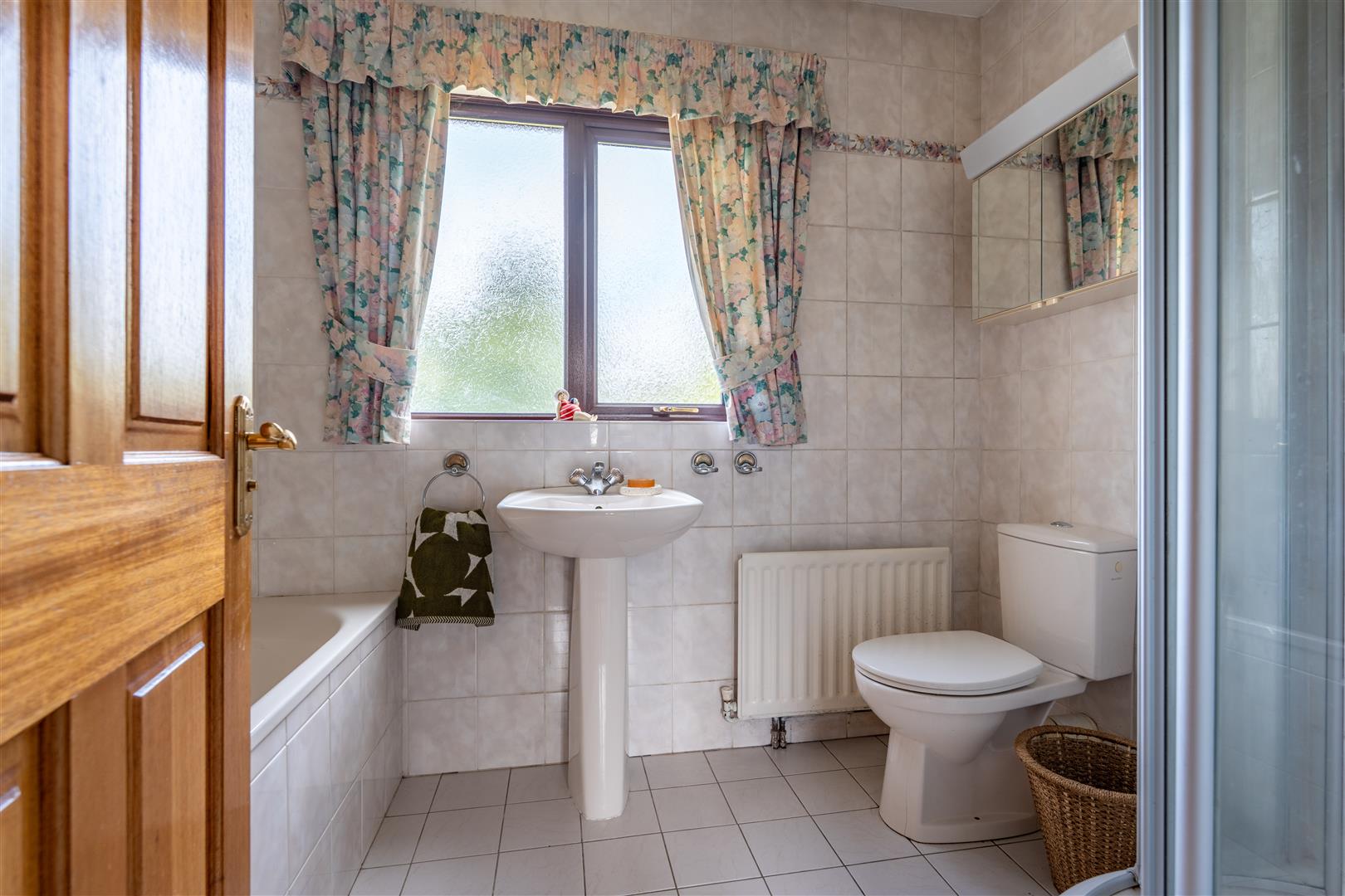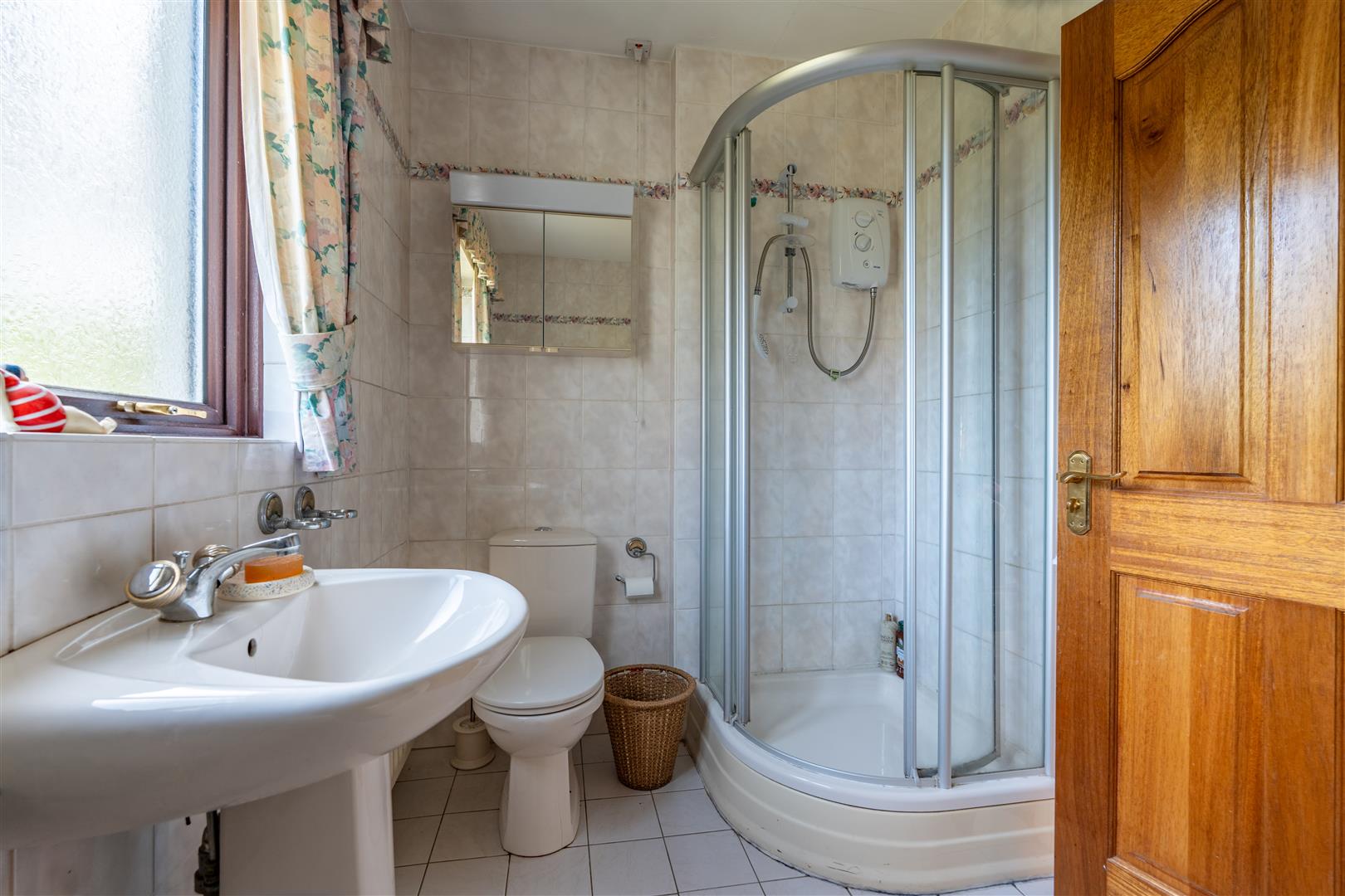 Tiled panel bath with off set taps and shower attachment, pedestal wash hand basin with feature mixer taps and push button low flush W/C. Fully tiled shower cubicle with "Triton" electric shower unit and sliding cubicle door. Fully tiled walls and floor. Single radiator.