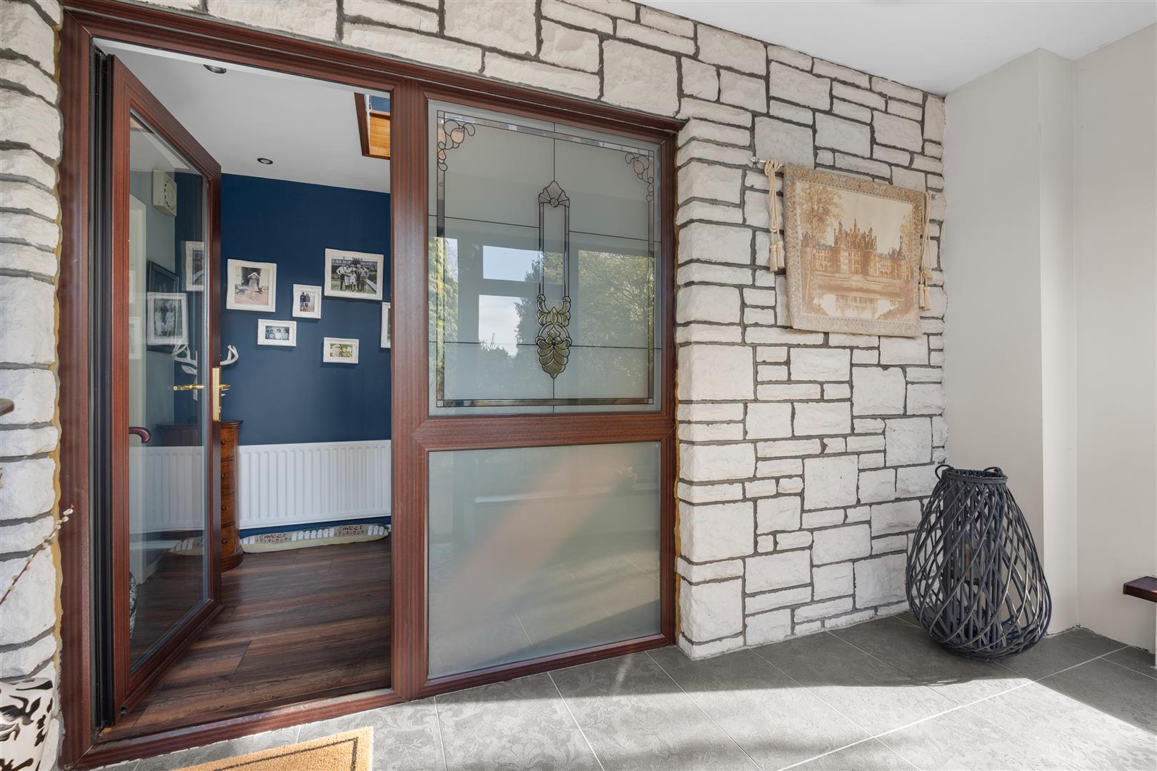 Fully tiled floor. Low voltage down lights. Mahogany effect PVC double glazed door and feature leaded glass sidelights to: