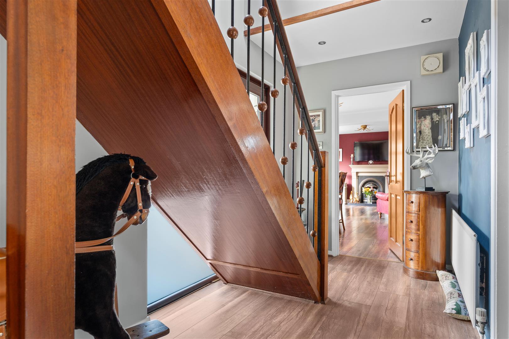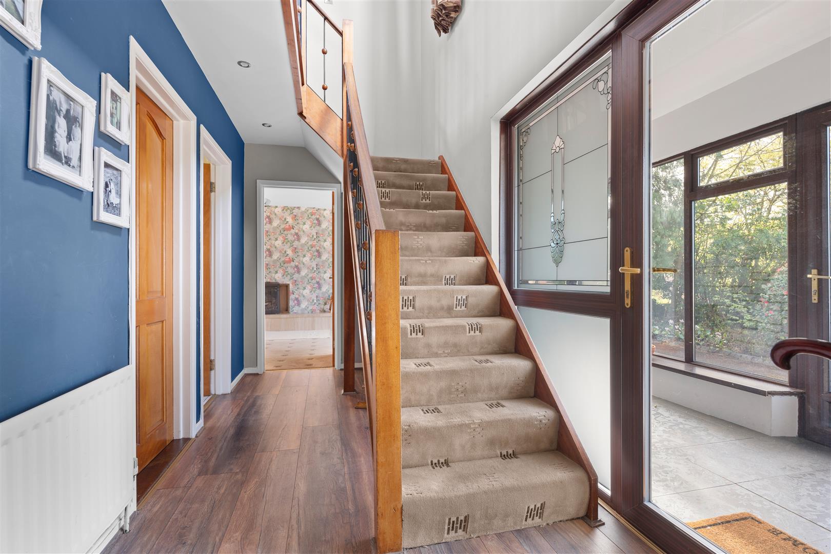 Staircase to first floor with mahogany handrail and feature wrought iron balustrade. Wood laminate floor. Open to under stairs. Single radiator.