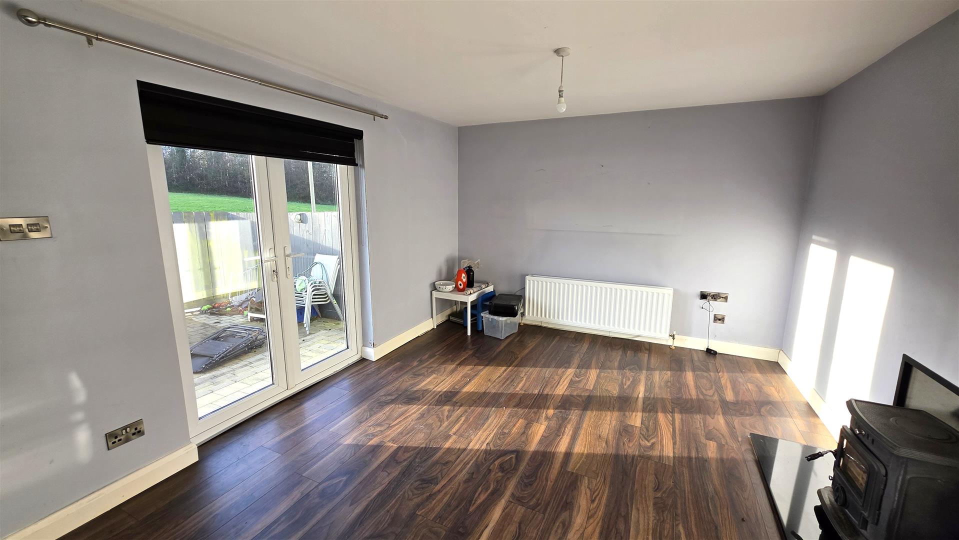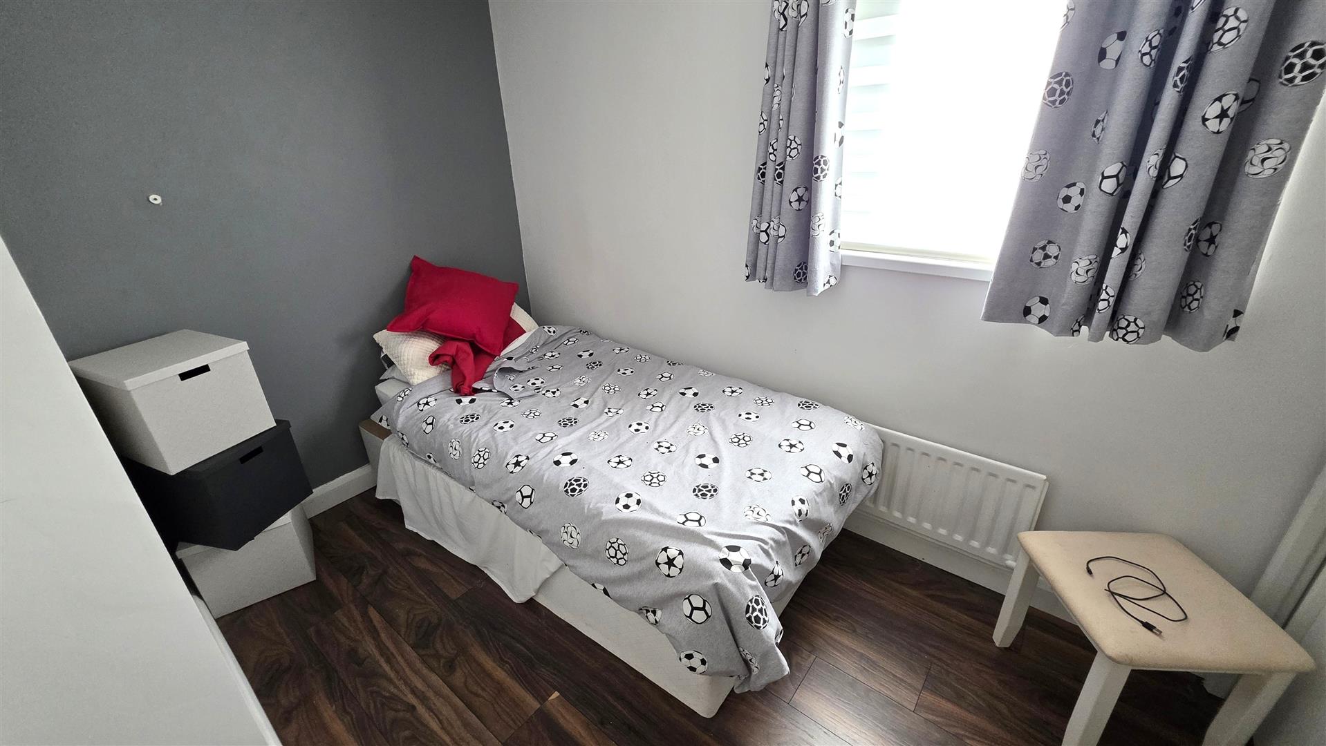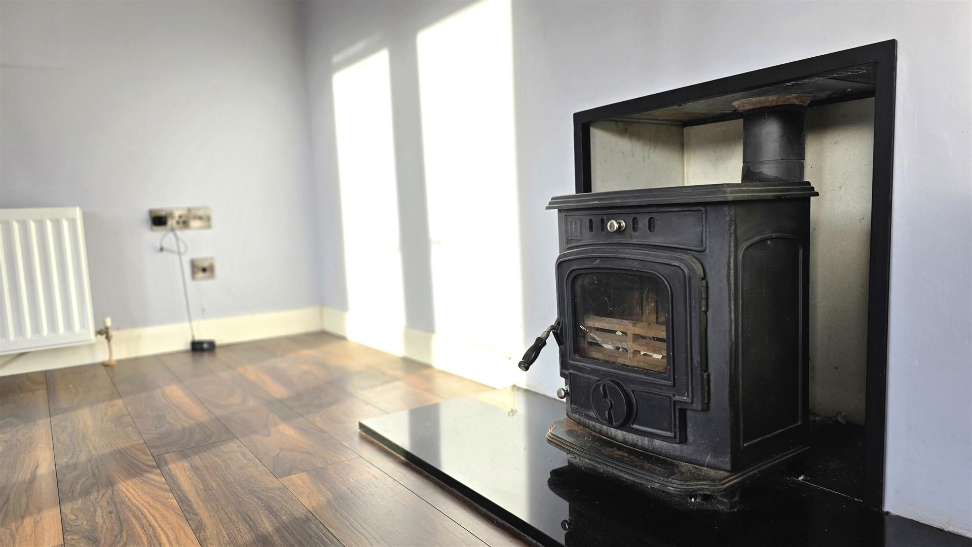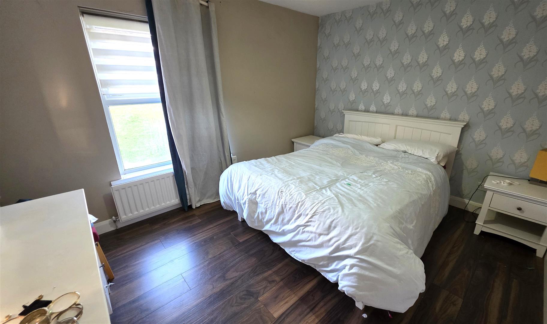 Walnut effect wood laminate floor. Double radiator.