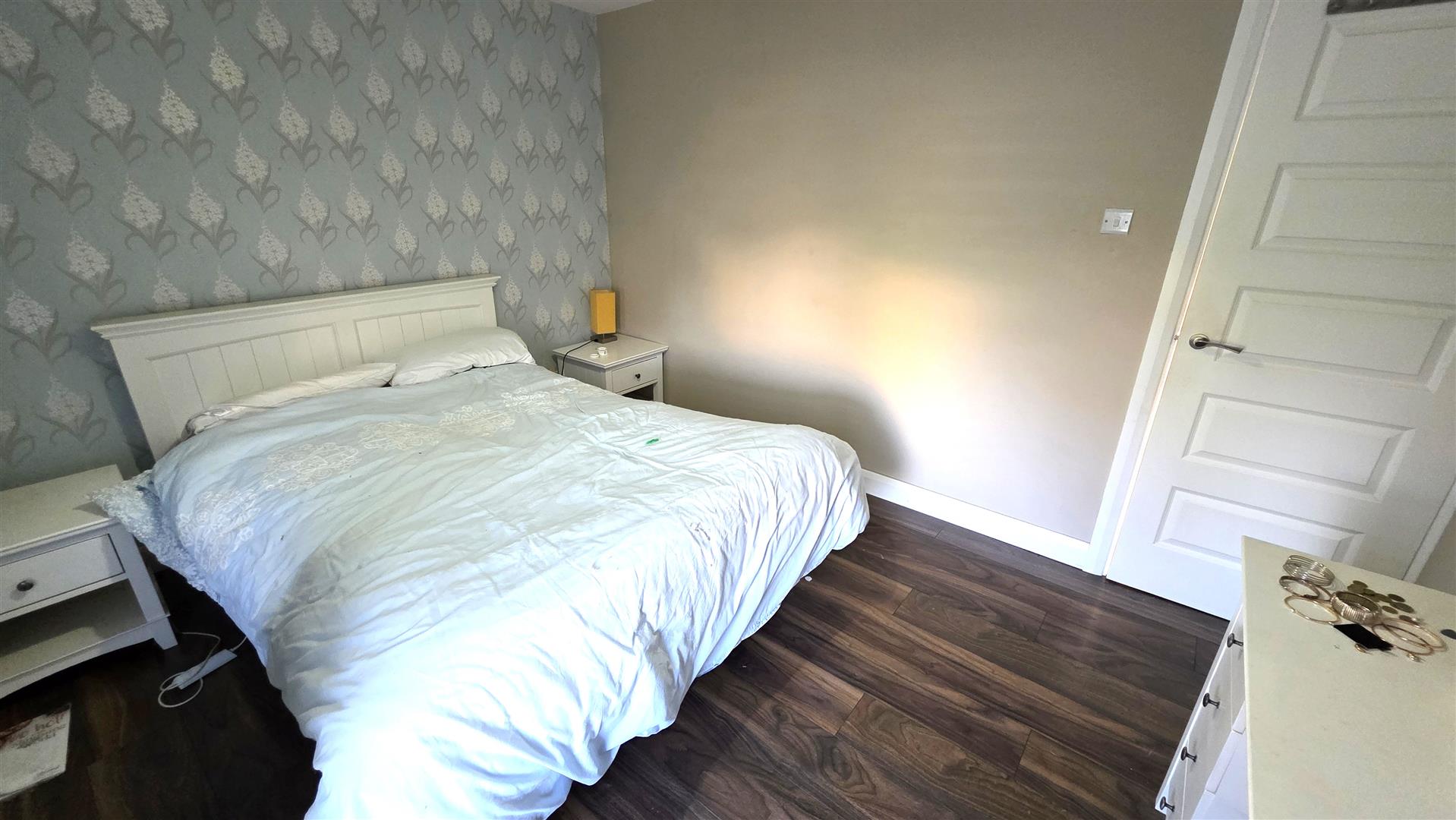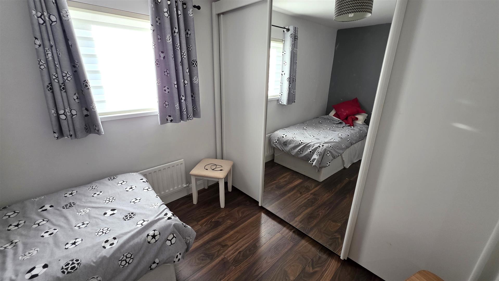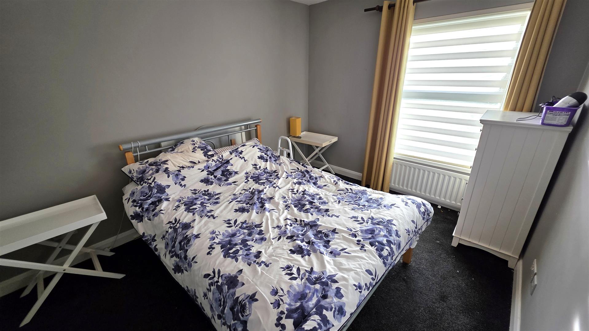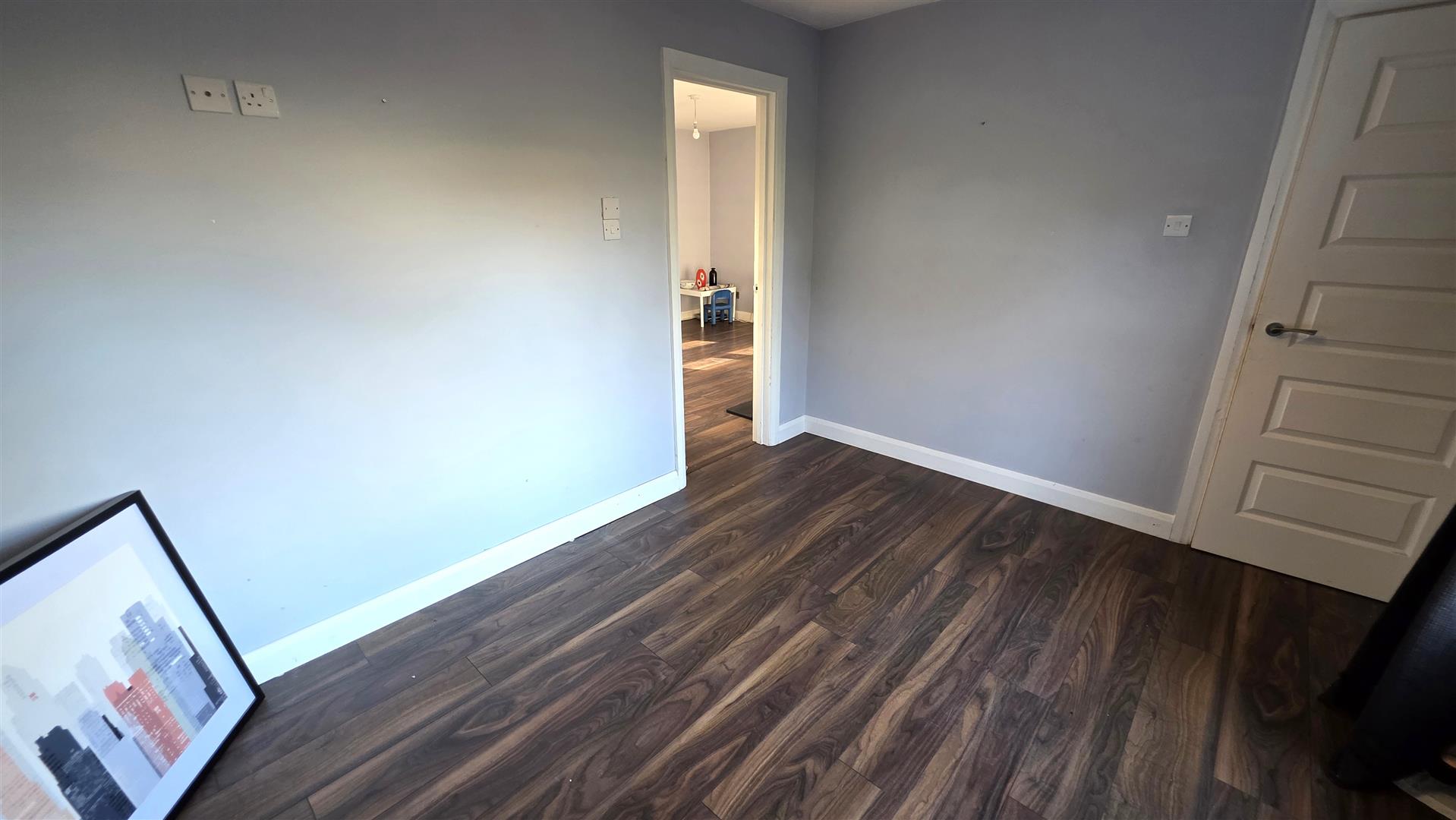 Walnut effect wood laminate floor. Double radiator.