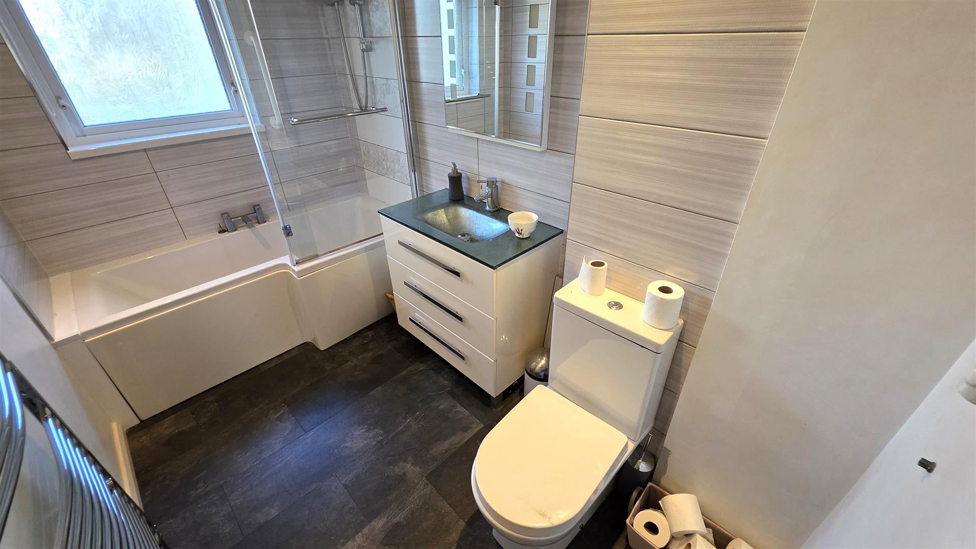 Modern white suite comprising shower bath with off-set mixer taps and "Mira" electric shower over. Glazed shower screen. Push button low flush W/C and feature glass moulded wash hand basin in vanity with monobloc mixer taps and storage drawers below. Part tiled walls with decorative insets. Low voltage downlights. Extractor fan. Wood laminate floor. Polished chrome heated towel rail.